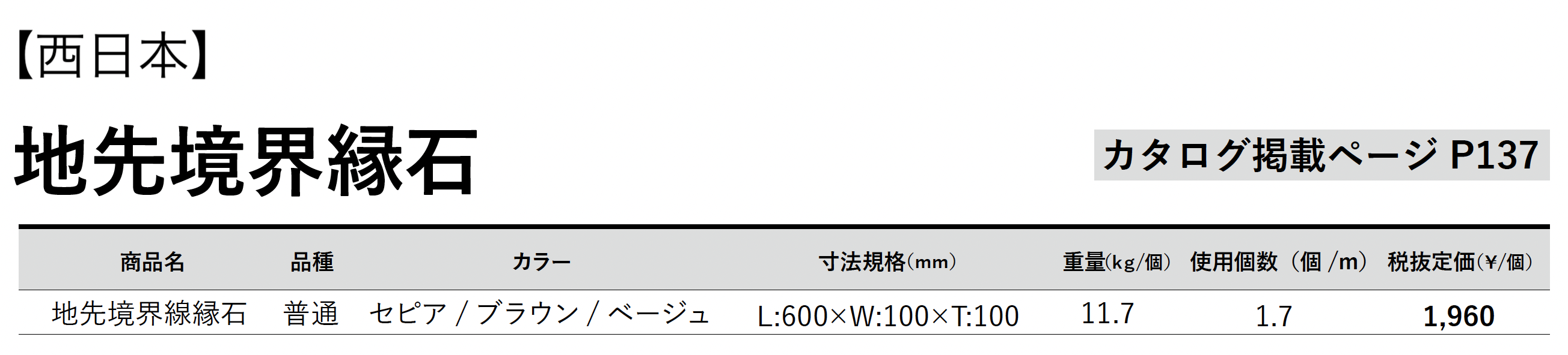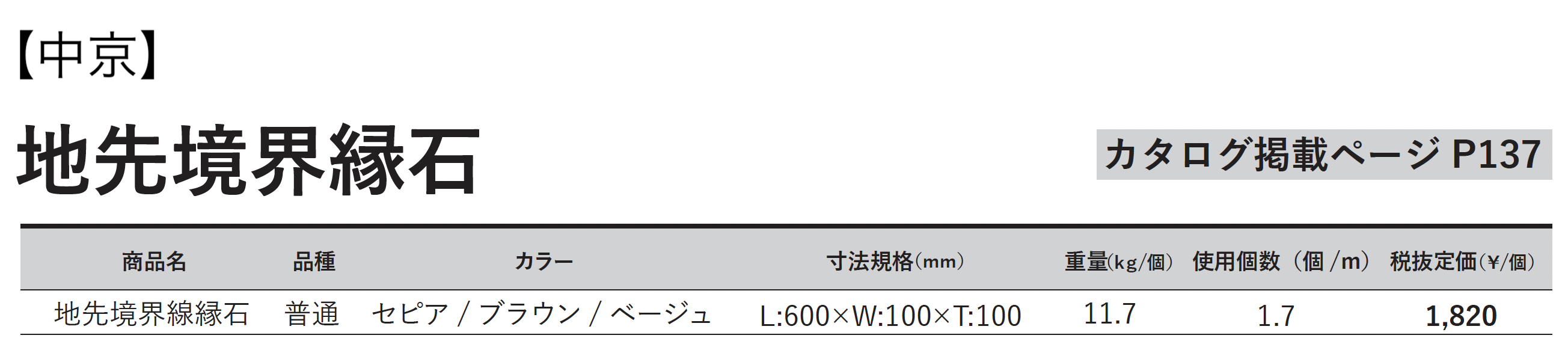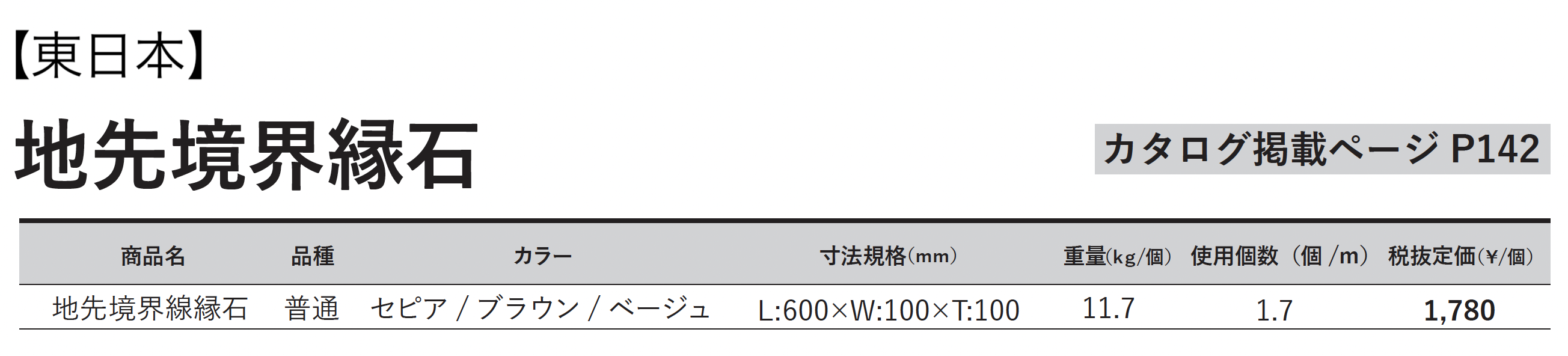 | 新旧品 | 地先境界縁石【2025年版】(EXTERIOR CATALOG 2025-2026)地先境界縁石【西日本・中京】【2024年版】(EXTERIOR CATALOG 2024-2025)地先境界縁石【西日本・中京】【2023年版】(エクステリアカタログ【Vol.1】) |