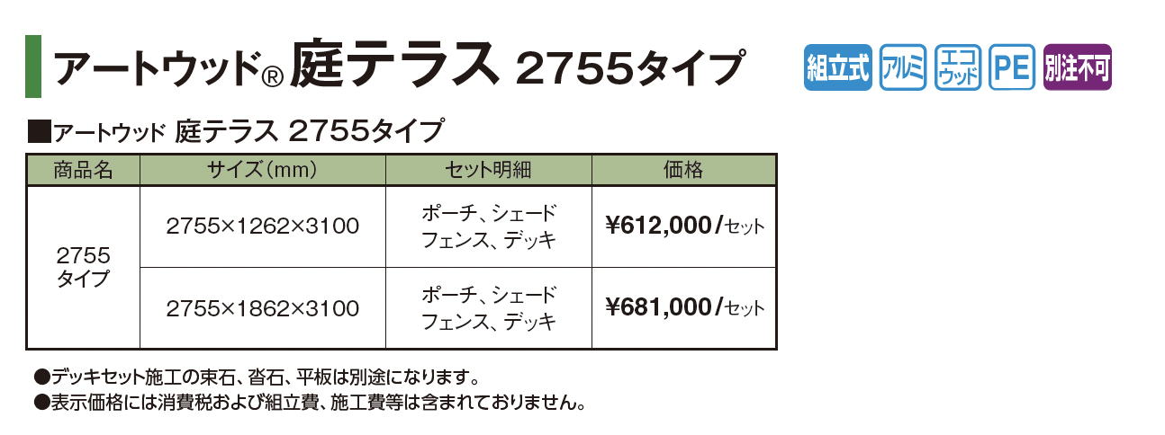 | 新旧品 | アートウッド®︎庭テラス 2755タイプ(プロガーデンエクステリア総合カタログPROEX2025)アートウッド®︎庭テラス 2755タイプ【2024年版】(プロガーデンエクステリア総合カタログ PROEX2024) |
