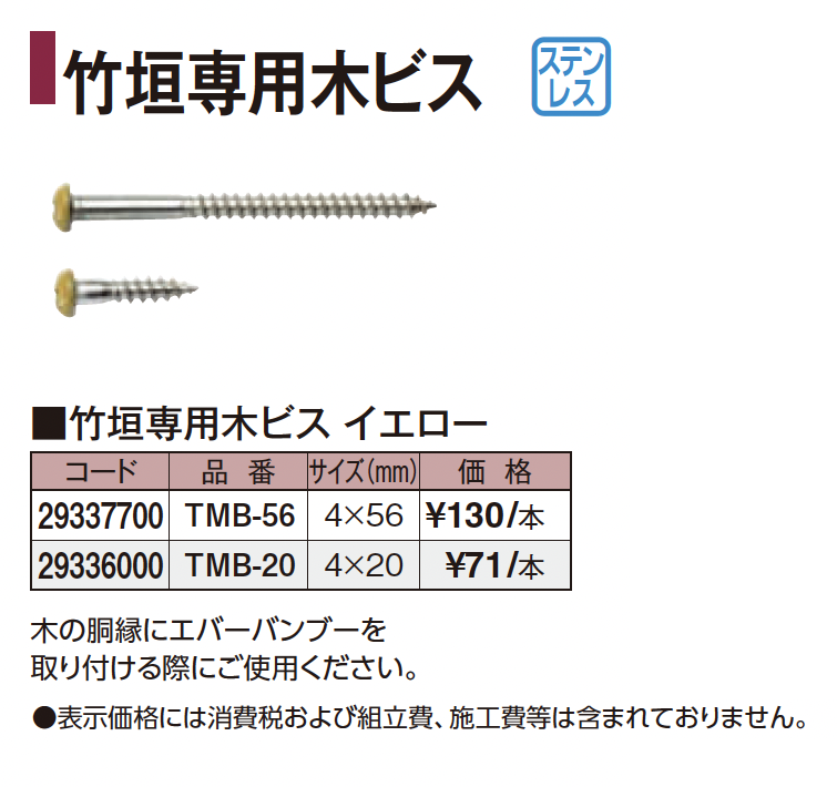 | 新旧品 | エバーバンブー®︎ 竹垣専用木ビス(プロガーデンエクステリア総合カタログPROEX2025)エバーバンブー®︎ 竹垣専用木ビス【2024年版】(プロガーデンエクステリア総合カタログ PROEX2024) |