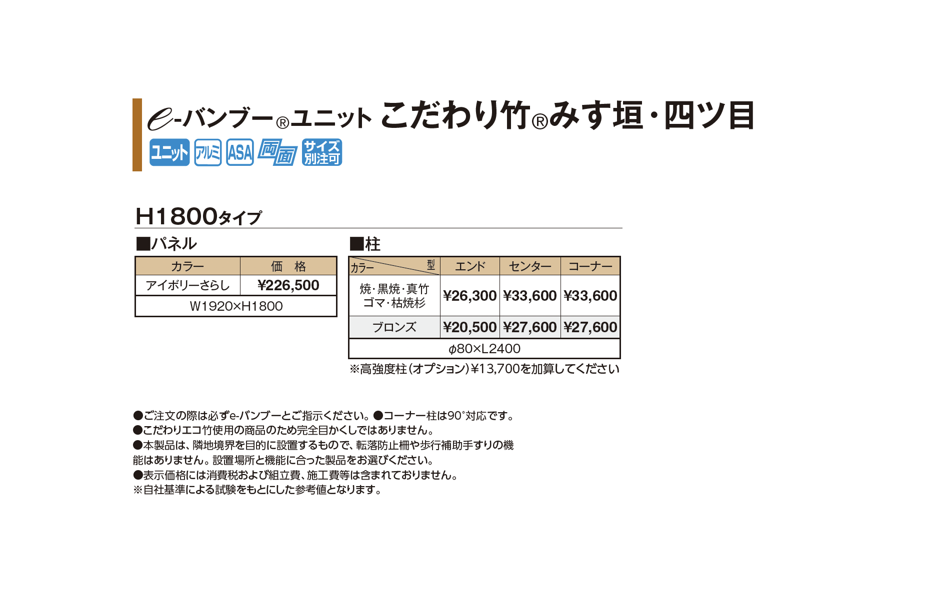 | 新旧品 | e-バンブー®︎ユニット こだわり竹®︎みす垣・四ツ目(プロガーデンエクステリア総合カタログPROEX2025)e-バンブー®︎ユニット こだわり竹®︎みす垣・四ツ目【2024年版】(プロガーデンエクステリア総合カタログ PROEX2024) |