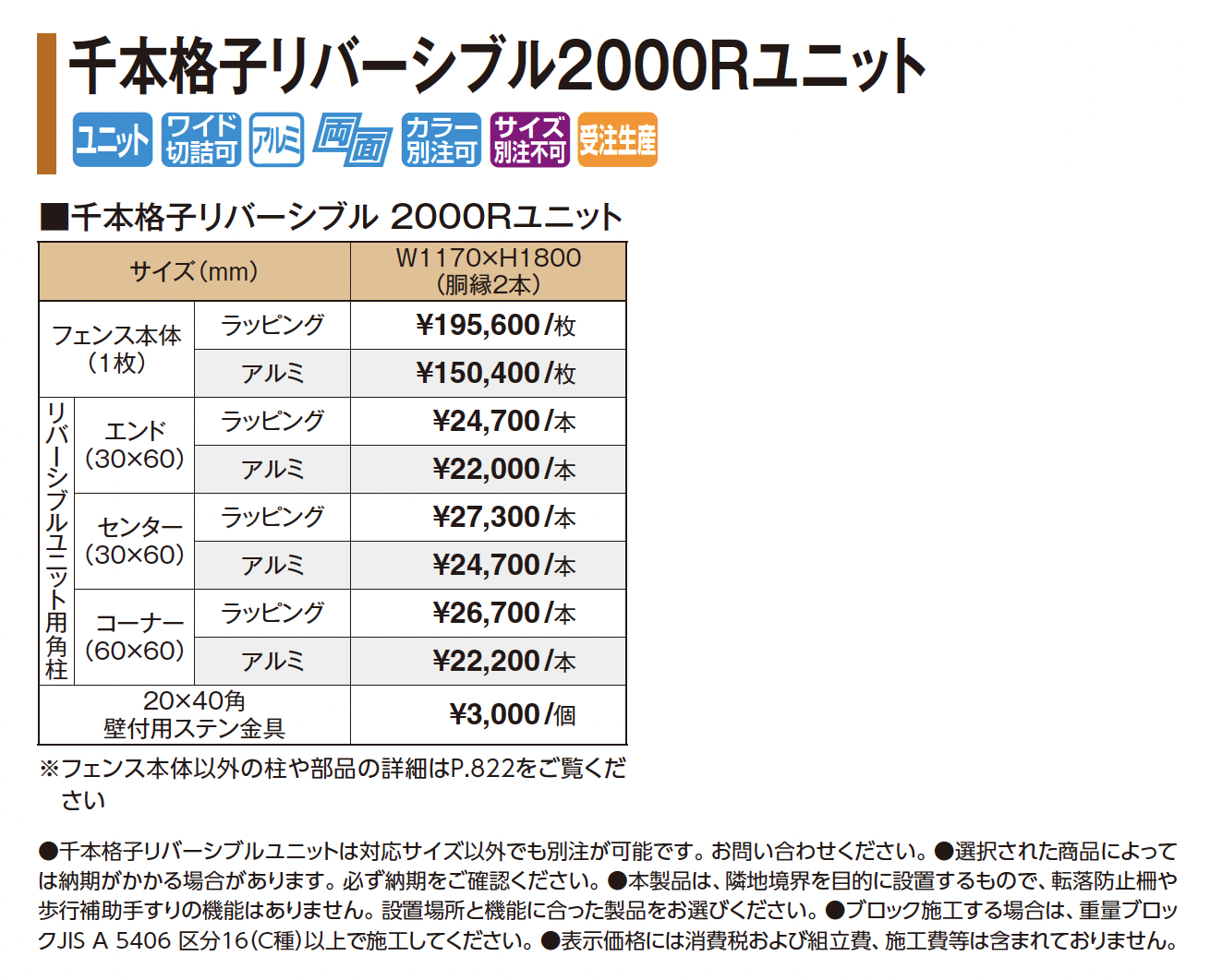 | 新旧品 | 千本格子リバーシブル2000Rユニット(プロガーデンエクステリア総合カタログPROEX2025)千本格子リバーシブル2000Rユニット【2024年版】(プロガーデンエクステリア総合カタログ PROEX2024) |