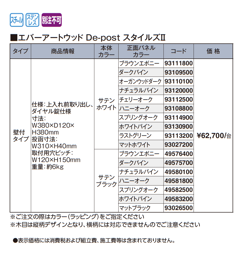 | カラー | サテンホワイト サテンブラック ブラウンエボニー ダークパイン オーガンウッドダーク チェリーオーク ナチュラルパイン ハニーオーク スプリングオーク マットホワイト ラストグリーン |