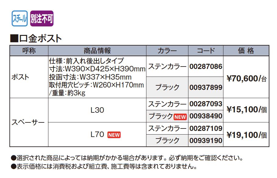 | 新旧品 | 口金ポスト(プロガーデンエクステリア総合カタログPROEX2025)口金ポスト【2024年版】(プロガーデンエクステリア総合カタログ PROEX2024) |