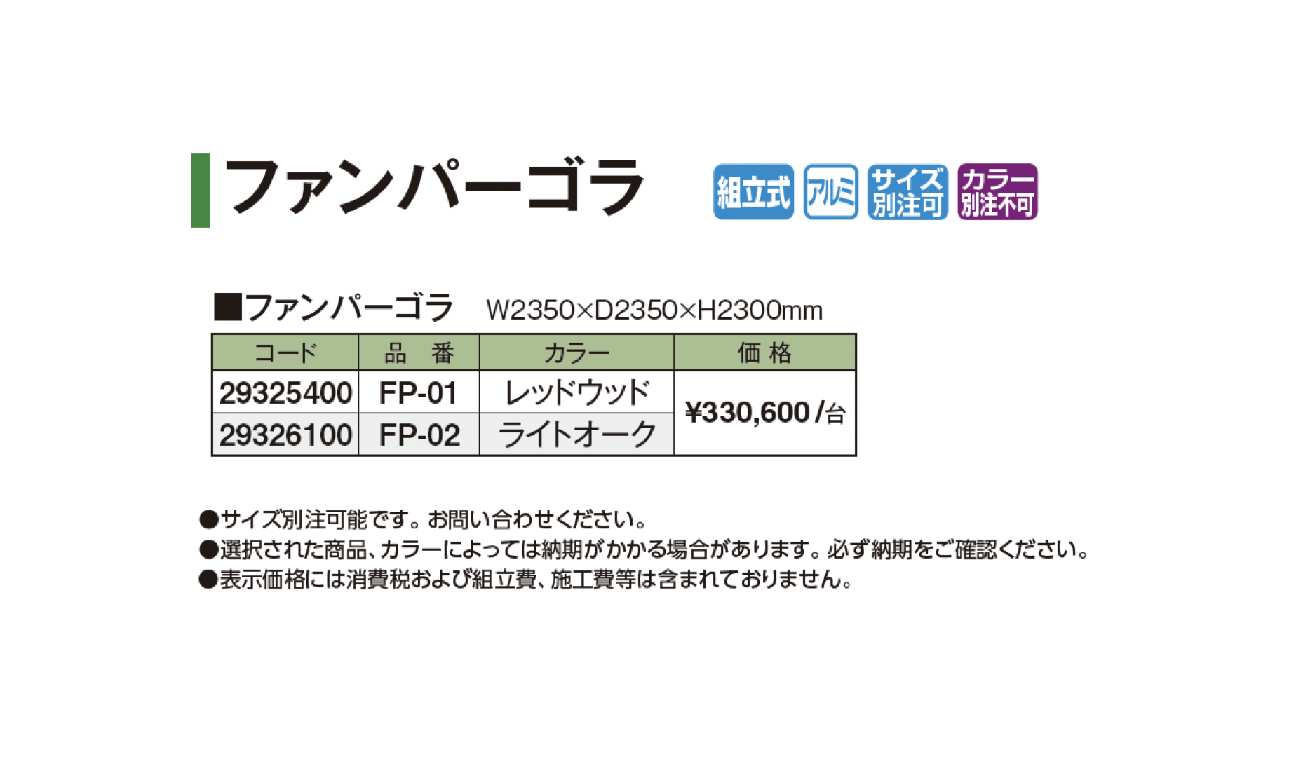| 新旧品 | ガーデンパーゴラ ファンパーゴラ(プロガーデンエクステリア総合カタログPROEX2025)ガーデンパーゴラ ファンパーゴラ【2024年版】(プロガーデンエクステリア総合カタログ PROEX2024) |
