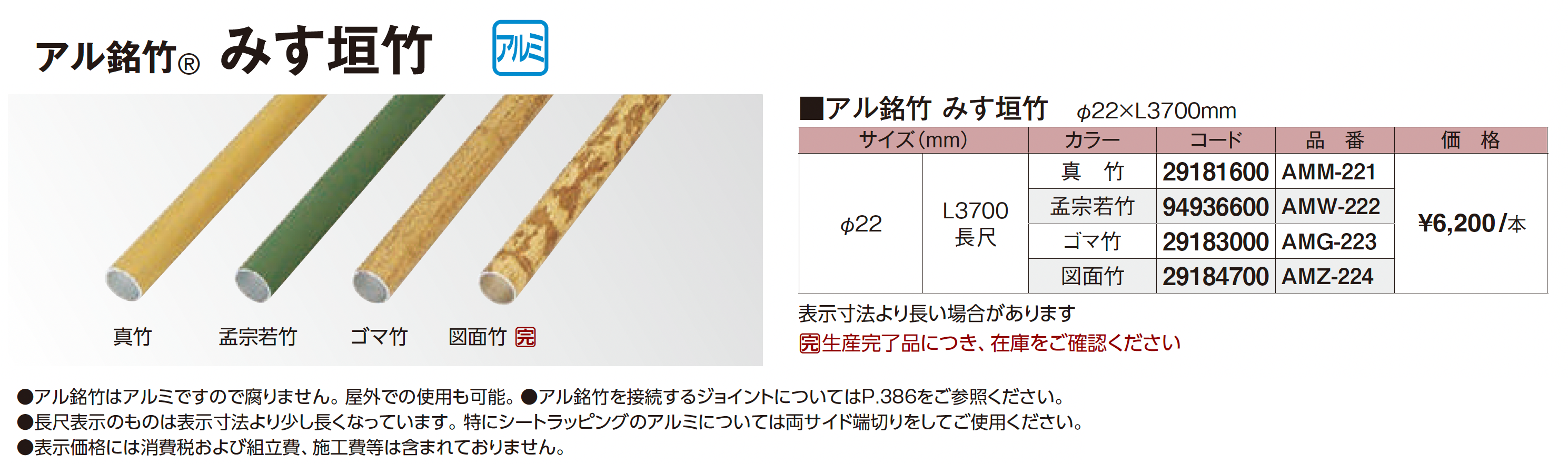 | カラー | 真竹 孟宗若竹 ゴマ竹 図面竹(生産完了品) |