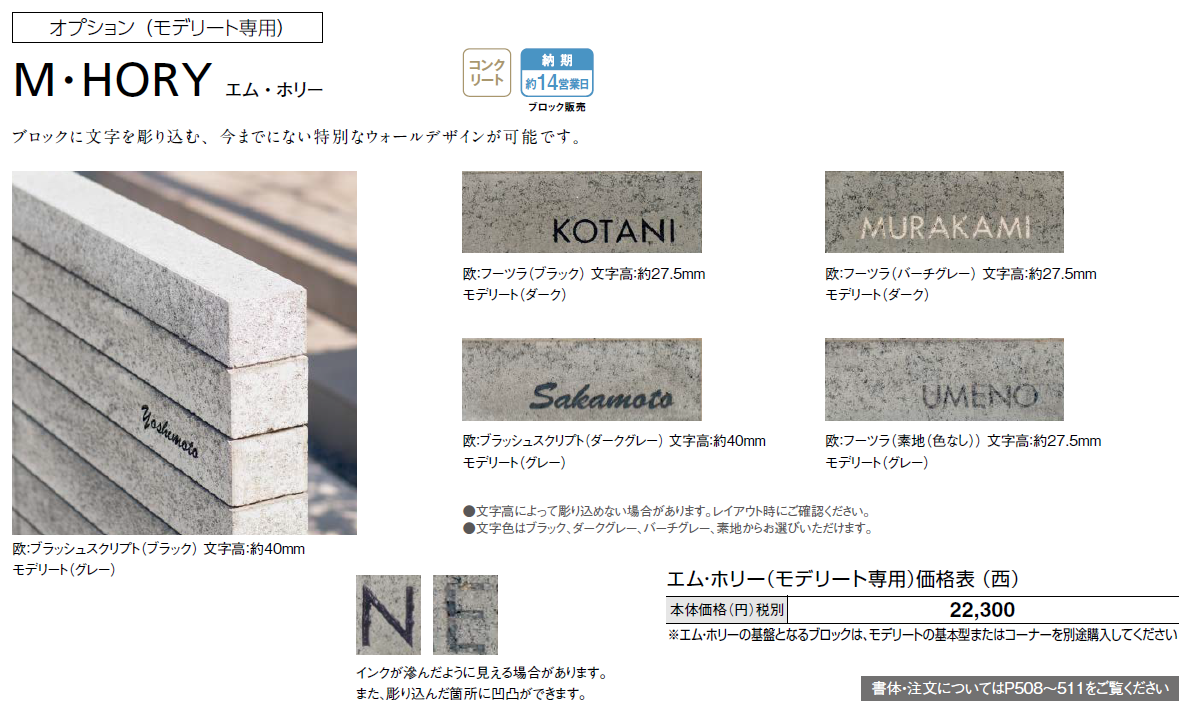 ●モデリートはコンクリートそのままのテクスチャーを表現していますので、製品表面の荒れ、若干の色ムラも特徴の一つです。 ●コンクリートブロックは、その目地塗面の全部にモルタルが行きわたるように組積してください。 ●製品の特性上、表面がこすれると白い傷が目立つ場合がありますので、取り扱いには十分にお気をつけください。 ●製造上、コーナー面の下部に小さなへこみが入ります。 ●オプションのエム・ホリーをご注文の場合、モデリートの納期がエム・ホリーと同じ約14日となります。