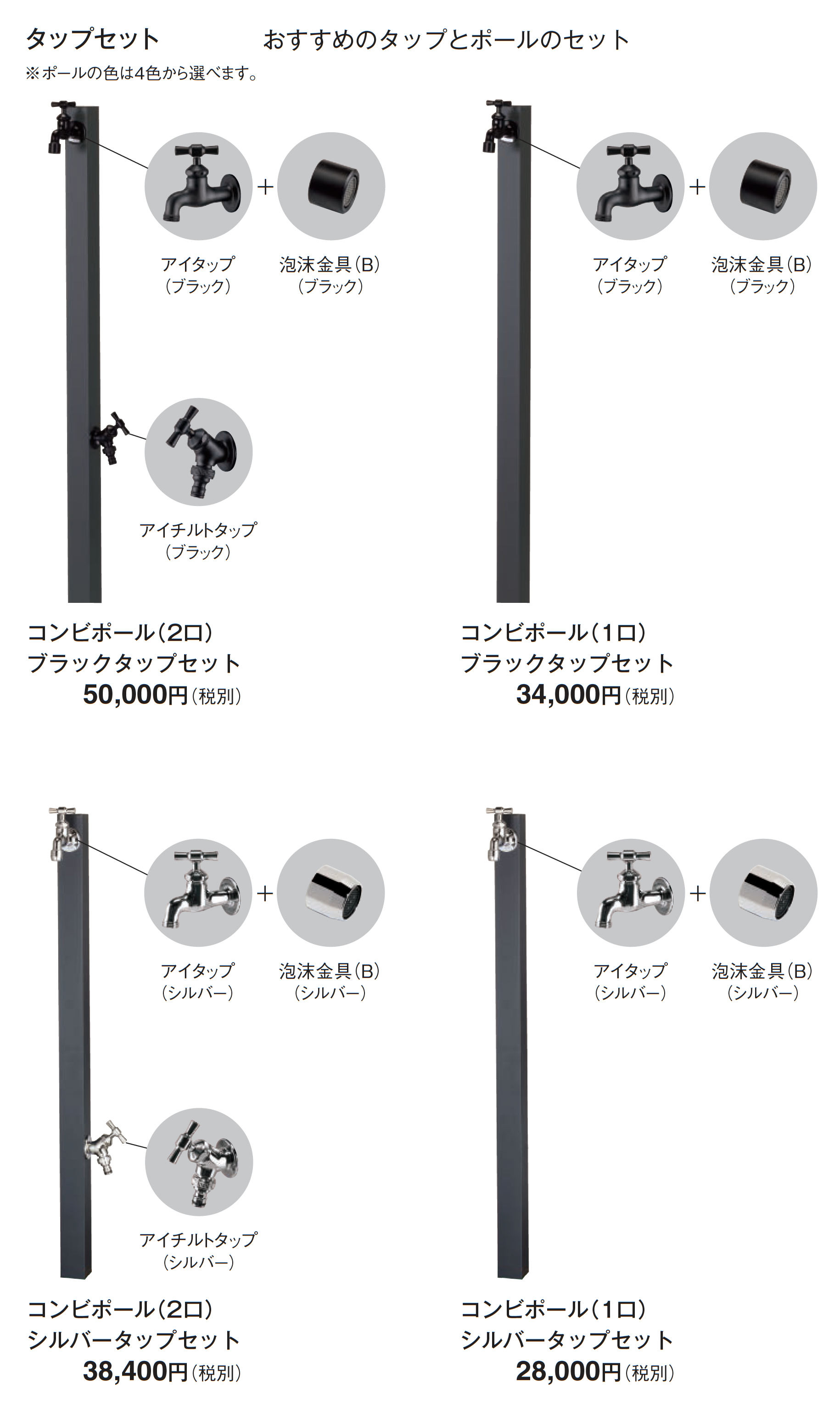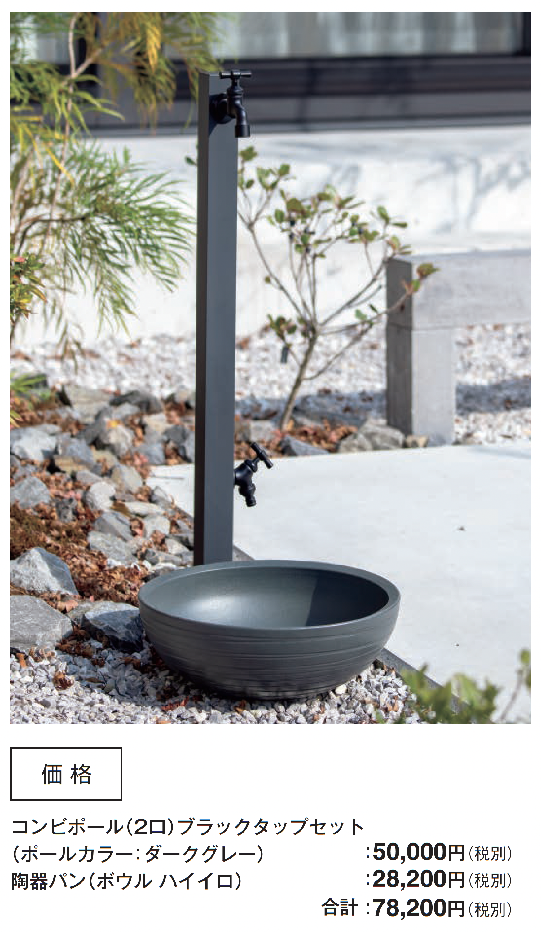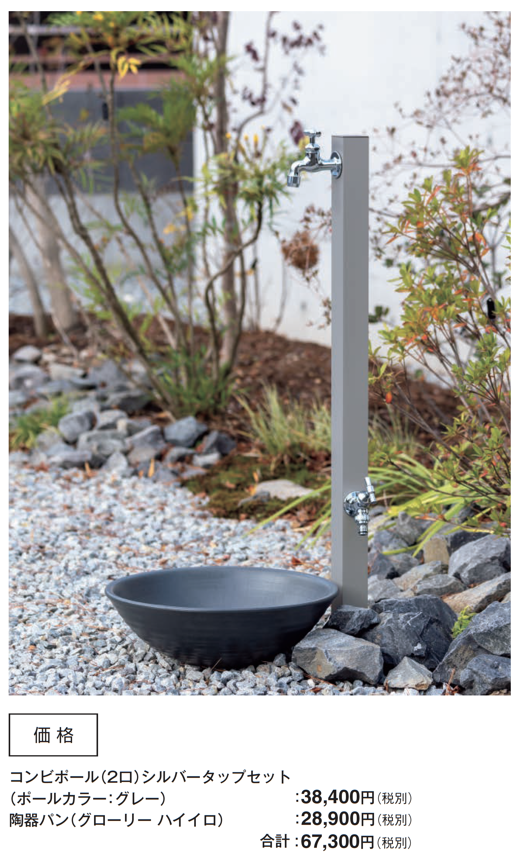 タップの凍結破損について タップが凍結破損した場合は、製品の交換はすべて有償となります。 ●ポール頭頂部のキャップは黒色の樹脂製です。 ●衝撃や擦れなどにより、製品表面が傷ついたりへこんだりする恐れがあります。取り扱いには十分にお気をつけください。 ●本体は錆びにくい素材ですが、錆びは発生します。特に塩害の恐れのある地域での使用、井戸水の使用、異物の付着などにより、錆び、変色を助長することがあります。 ●水道工事は水道工事店にご依頼ください。 ●寒冷地用製品ではありません。配管内の水の凍結が考えられる場合は、配管内の水を抜く、ヒーター等で保温する、蛇口から少量の水を出し続けるなど、地域、気候に応じた凍結防止対策を行ってください。 ●凍結の恐れのある地域では、別途、水抜栓を設置してください。 ●パン内に水がたまることがあります。