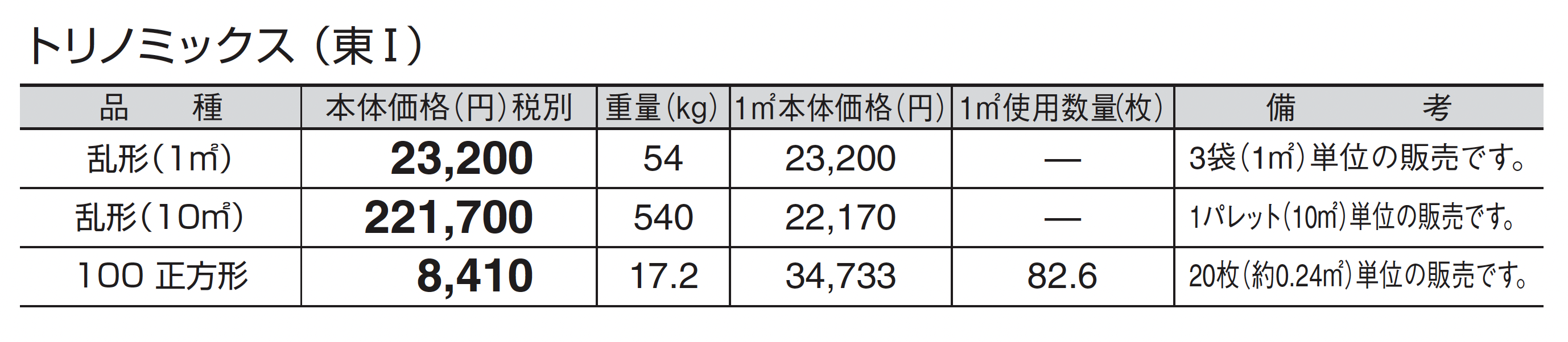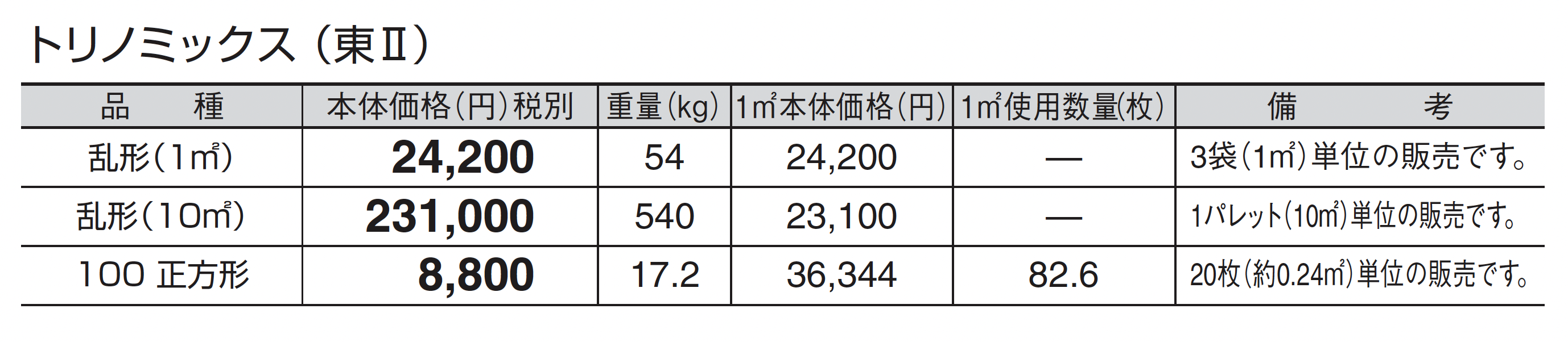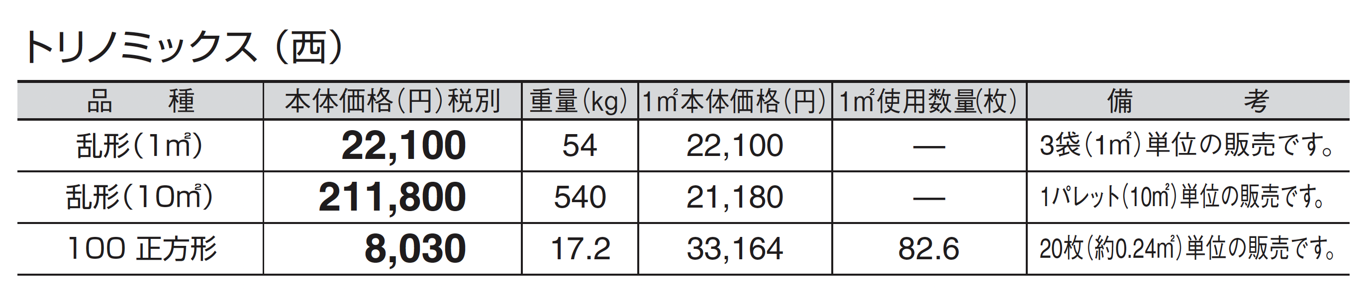 ●施工時にモルタルが表面に付着しないように注意してください。表面に付着したモルタルを洗い流す場合は、充分きれいな水で流してください。 ●設置条件、施工方法によってはモルタルのアクが表面に廻り、変色する恐れがあります。変色を抑えるため、浸透性吸水防止剤等の塗布をおすすめします。 ●トリノミックスは天然石の性質上、白いコスレが入る場合があります。 ●天然石の特性上サビが入る場合があります。また、サビの出やすい成分を含んでいます。 ●必ず仮置きして、色、大きさのバランスを確認してから施工してください。裏・表で色が異なりますのでバランスを見て表・裏をご使用ください。 ●層状に剥離しそうな場合は、強制的にはがしてから施工してください。 ●乱形は、施工にロスがありますので、施工面積の2割前後余分の数量が必要です。 ●酸に弱いので酸洗いは避けてください。 ●輸入品のため欠品になる場合がありますので、納期をご確認ください。