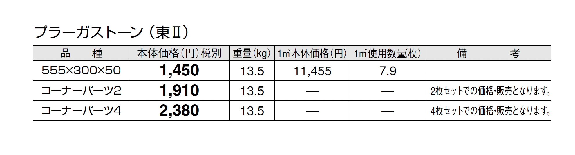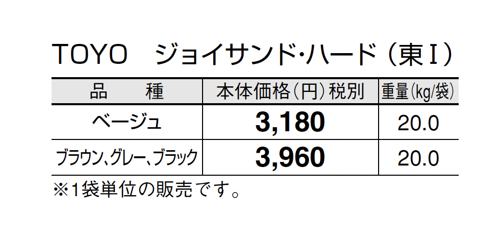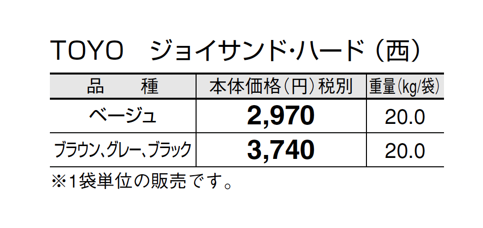 ●TOYOジョイサンド・ハードの施工方法、注意事項はP560をご参照ください。 ●使用量の目安は1袋/20kg当たりで5㎡の敷設となります。 ●自然な風合いを出すため表面の色合い、テクスチャーに幅をもたせてあります。 ●表面意匠は3パターンあります。(柄の指定はできません。) ●突き合わせて施工しますが、製品特性上あえて目地幅がランダムになるようにしています。 ●面取りが無い商品のため、面取りのある製品と比べて角 に接触すると欠けやすくなっておりますのでお取扱いにご 注意ください。 ●軒下や湿気を伴う場所にはウレタン樹脂で固める固定目地材での施工を行ってください。施工方法及び注意事項はP560をご参照ください。