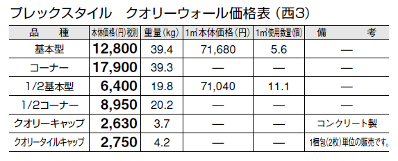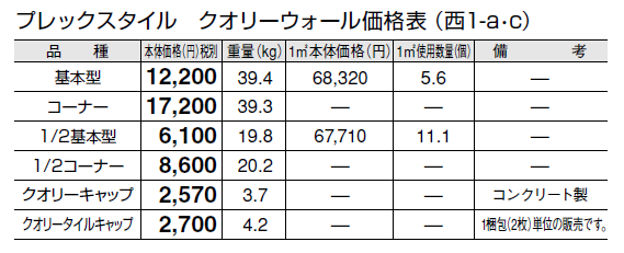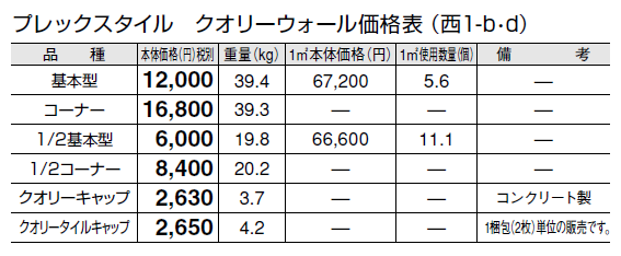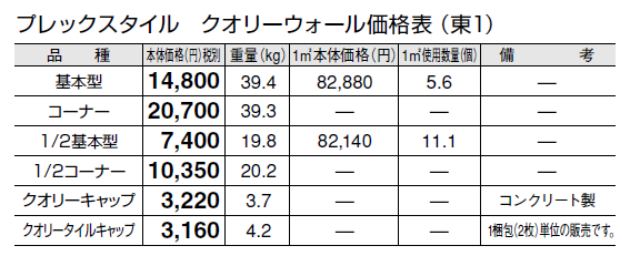 ●クオリーキャップはコンクリート製です。 ●クオリーキャップには、裏面に脱落防止のため「ステンレス棒」を設置しております。 ●クオリータイルキャップには、「ステンレス棒」はついていません。 ●ブロック間は、4㎜程度の間隔をとって配置し、モルタルを充填してください。(タイルの目地間隔が≒5㎜になります)柔らかすぎるモルタルを使用すると、ブロック間から染み出る可能性がありますので、ご注意ください。 ●クオリーキャップの取り付けには、樹脂モルタルを使用することを推奨します。 ●クオリータイルキャップの取り付けは、ブロック天端にモルタルを充填し、平らに仕上げ、モルタルの養生期間を経た後に、コンクリートとタイルに対応した接着剤を使用して貼り付けてください。 ●クオリーウォールのタイル箇所(特に端部)は、衝撃等により欠ける可能性があります。取り扱いには十分注意してください。 ●クオリーウォールのタイル箇所は焼物ですので、製品ごとに色幅があります。また、製造ロットにより寸法、色のバラつきがあります。 ●クオリーウォールに穴あけ加工やカット処理を行う際には、必ずタイル用の工具をご使用ください。また、製品端部への加工や過度な圧力を加えるなどにより、タイルに割れや亀裂がおこる場合があります。 ●輸入品のため欠品になる場合がありますので、納期をご確認ください。