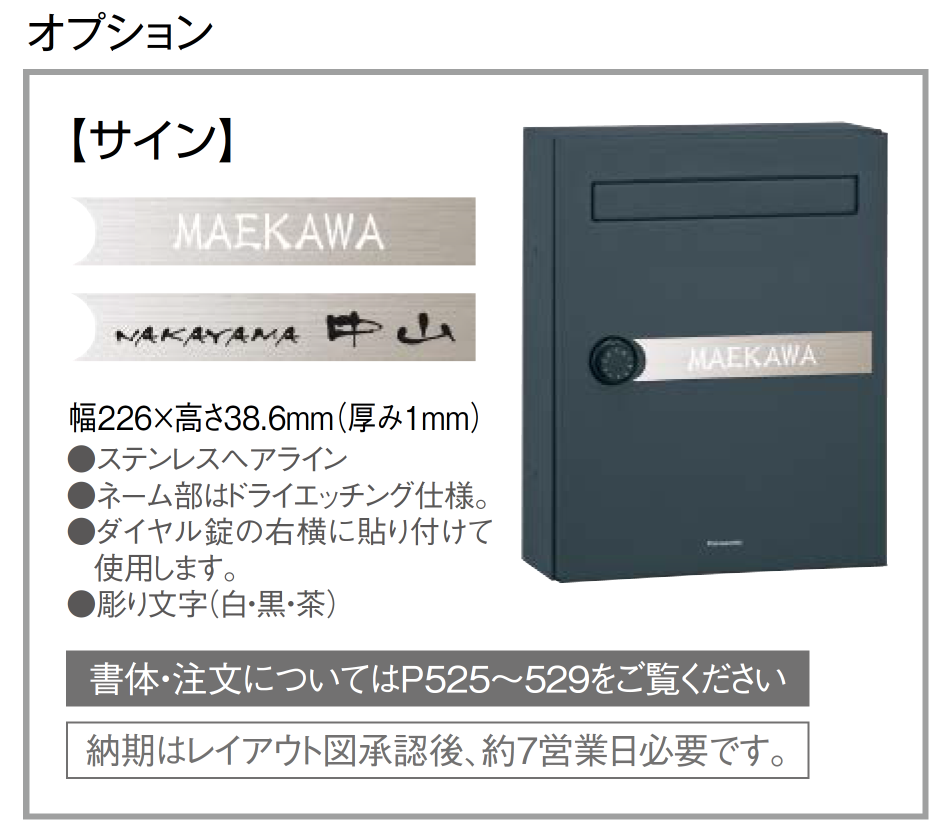 ●納期は約5営業日、サイン(オプション)の場合は7日間必要です。 ●施工前に必ず同梱の施工手順書をお読みください。 ●雨天時の投函で、内部に雫等が入る場合があり、郵便物が濡れることもございます。 ●ご注文後のキャンセルはお受けできません。