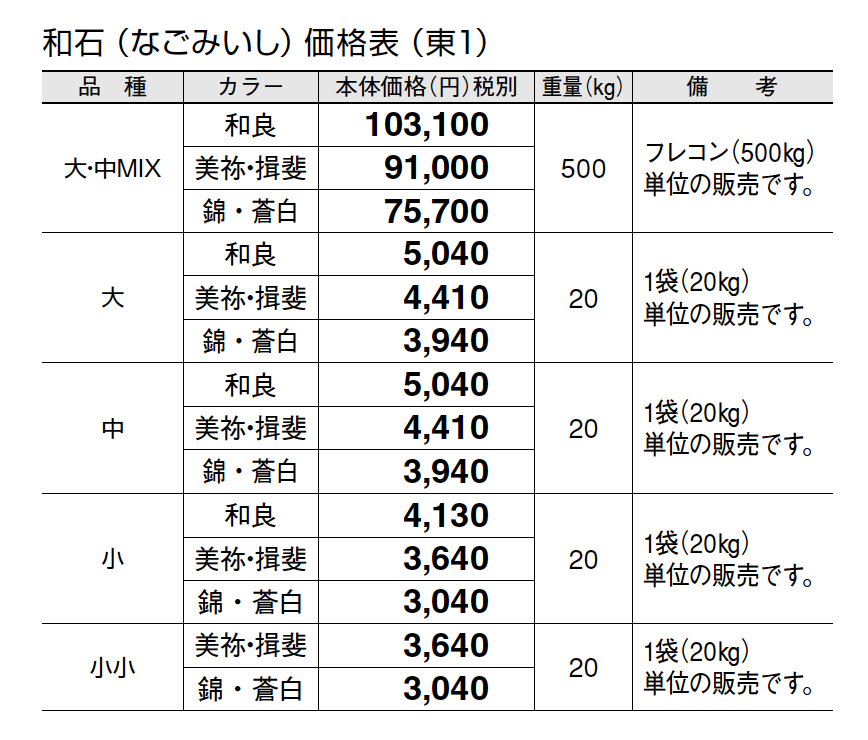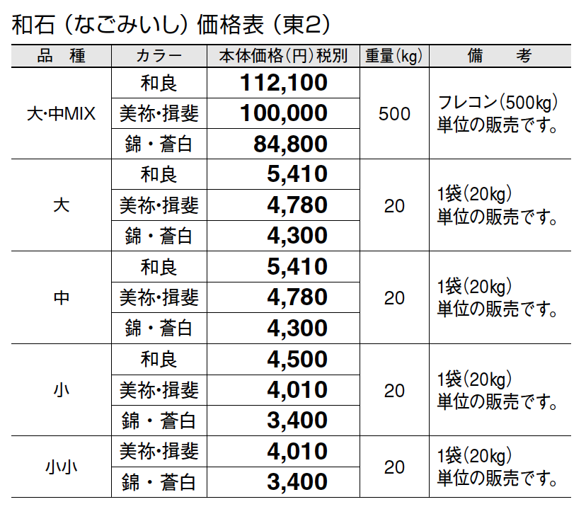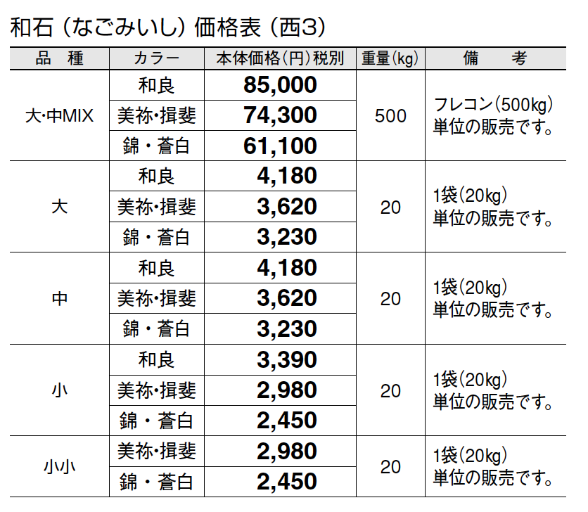 ●天然石のため、色・寸法・形状にバラツキがあります。 ●酸に弱いので酸洗いは避けてください。 ●必ず仮置きして、色・バランス・大きさのバランスを確認してから施工してください。 ※石材商品すべてはサビの出やすい成分を含んでいます。 ●1㎡あたりの必要袋数は目安です。 ※石材粒形を重なり無しでほぼ均等に敷設した場合の目安量です。 ※石材敷設時に起きる、粒形の隙間等は考慮しておりません。 ※石材粒形に大きなバラツキがあり、必ずしもこの限りではありません。