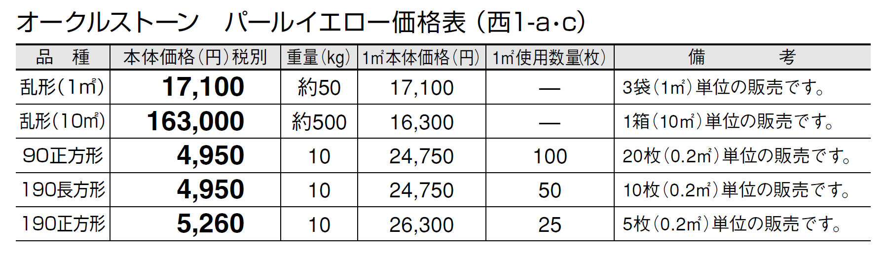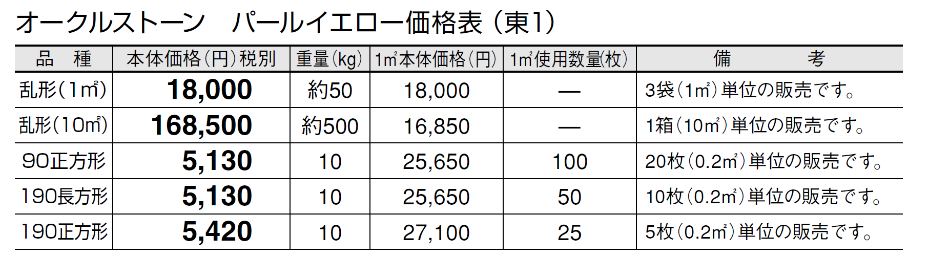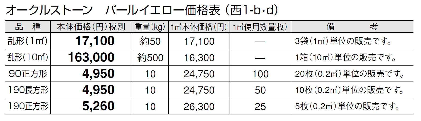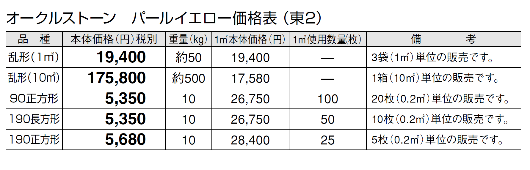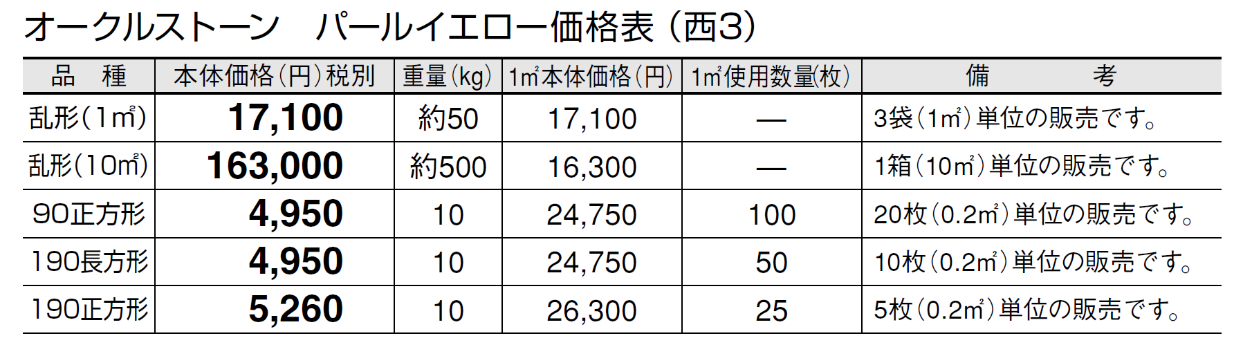 ●石材の性質上、車輌等が乗り入れすると表面が割れる恐れがありますので、そのような場所にはご使用にならないでください。 ●パールイエローの方形タイプは天然石の風合いを活かすため、一つ一つを手割り仕上げしております。大きさに幅があり、また、いびつな形状も含まれます。 ●施工時にモルタルが表面に付着しないように注意してください。表面に付着したモルタルを洗い流す場合は、充分きれいな水で流してください。 ●設置条件、施工方法によってはモルタルのアクが表面に廻り、変色する恐れがあります。変色を抑えるため、浸透性吸水防止剤等の塗布をおすすめします。 ●オークルストーンは天然石のため写真よりも、一枚ごとに色、厚さ、大きさに幅があります。特にパールイエローは色幅が大きいのが特徴です。また、色幅が偏る場合もあります。 ●天然石の特性上、スジ、ヒビ、ヘアクラック等が発生している場合があります。 ●サビの出やすい成分を含んでいます。 ●サビの発生を抑える対策として施工後、施工面全体に吸水防止剤「アクアシール」(P585)の塗布をお勧めします。 ●必ず仮置きして、色、大きさのバランスを確認してから施工してください。裏・表で色が異なりますのでバランスを見て表・裏をご使用ください。 ●層状に剥離しそうな場合は、強制的にはがしてから施工してください。 ●乱形は、施工にロスがありますので、施工面積の2割前後余分の数量が必要です。 ●酸に弱いので酸洗いは避けてください。 ●輸入品のため欠品になる場合がありますので、納期をご確認ください。 ●施工の際は、製品裏面に浸透性吸水防止剤を塗布してください。吸水防止剤は「アクアシール」(P585)を推奨します。 ●高圧洗浄機を使用してメンテナンスを行うと、表面の色が変わることがありますのでご注意ください。 ●車輌乗り入れ部には適しませんのでご注意ください。