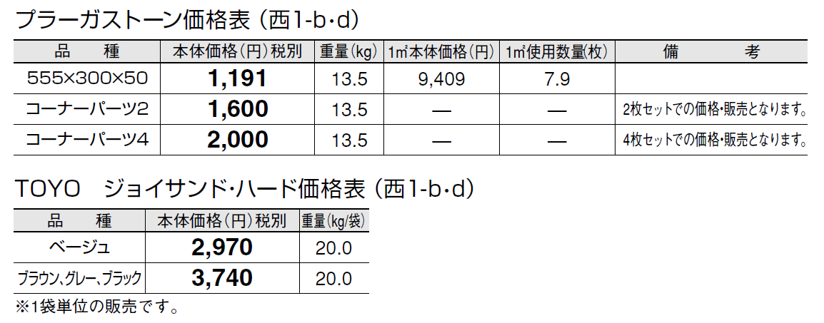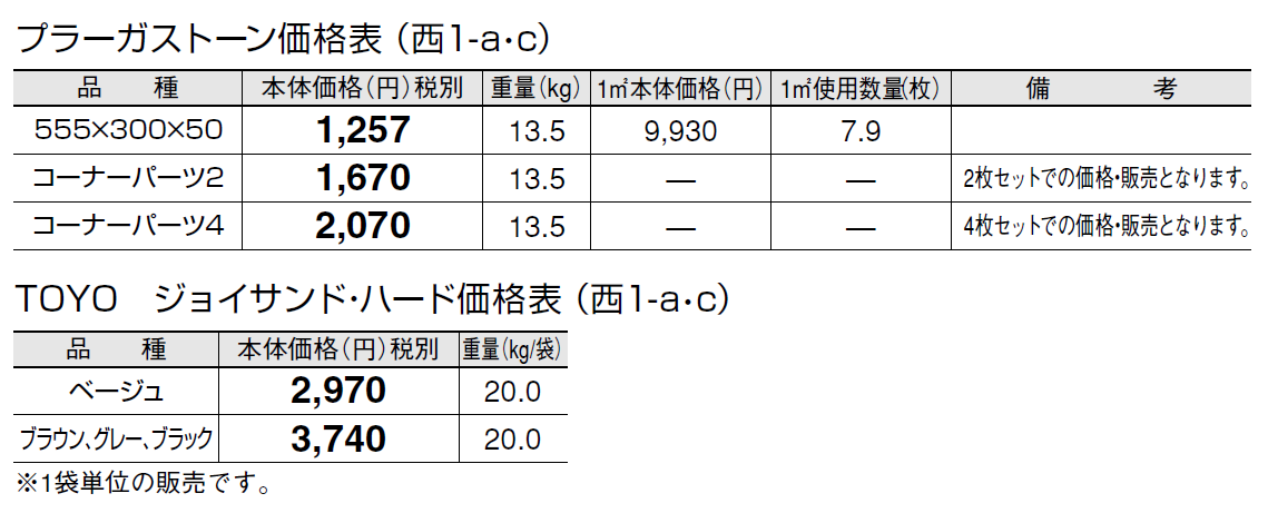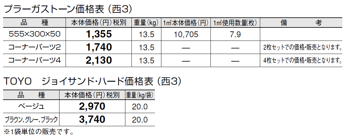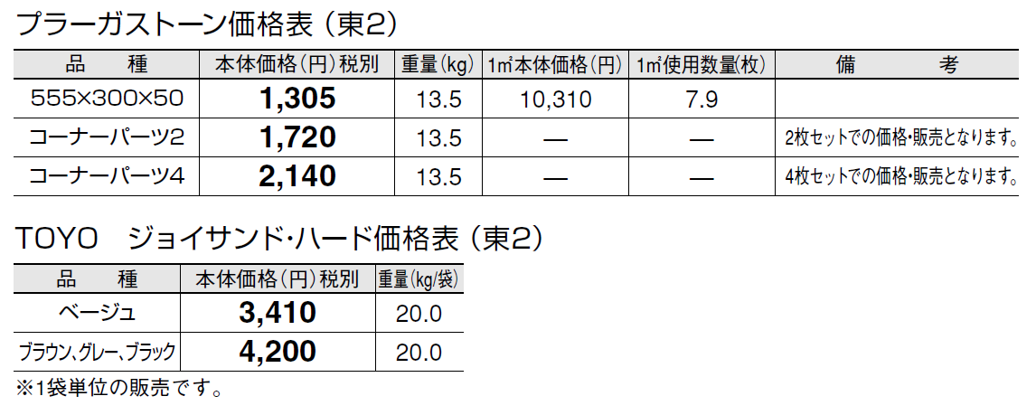 ●TOYOジョイサンド・ハードの施工方法、注意事項はP550をご参照ください。 ●使用量の目安は1袋/20kg当たりで5㎡の敷設となります。 ●自然な風合いを出すため表面の色合い、テクスチャーに幅をもたせてあります。 ●表面意匠は3パターンあります。(柄の指定はできません。) ●突き合わせて施工しますが、製品特性上あえて目地幅がランダムになるようにしています。 ●軒下や湿気を伴う場所にはウレタン樹脂で固める固定目地材での施工を行ってください。施工方法及び注意事項はP550をご参照ください。
