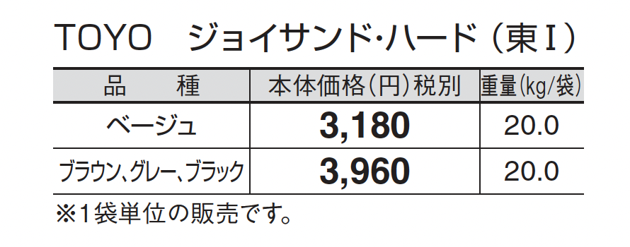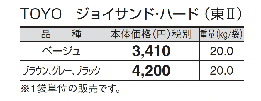 ●TOYOジョイサンド・ハードの施工方法、注意事項はP560をご参照ください。 ●使用量の目安は1袋/20kg当たりで5㎡の敷設となります。 ●自然な風合いを出すため表面の色合い、テクスチャーに幅をもたせてあります。 ●軒下や湿気を伴う場所にはウレタン樹脂で固める固定目地材での施工を行ってください。施工方法及び注意事項はP550をご参照ください。