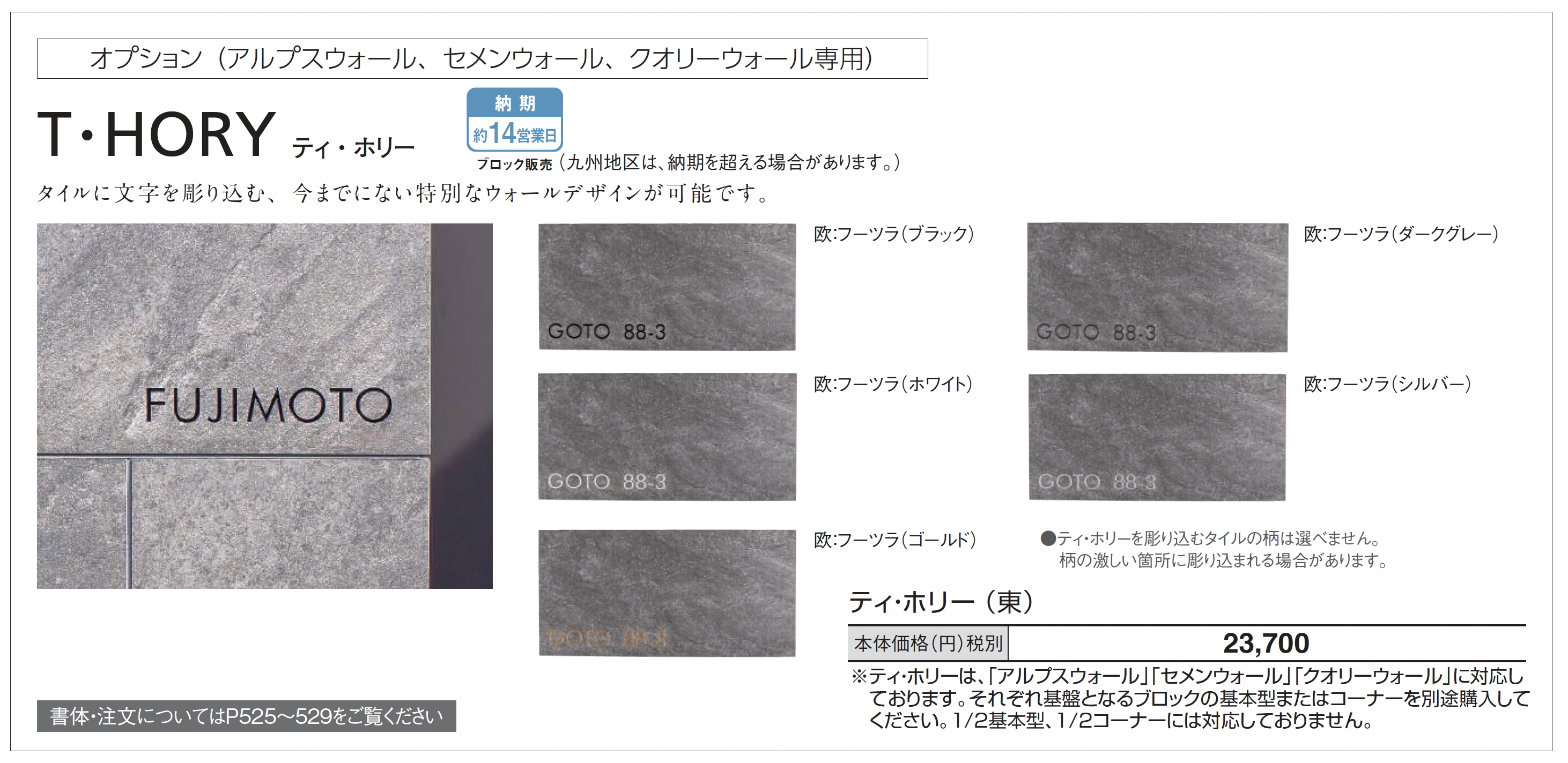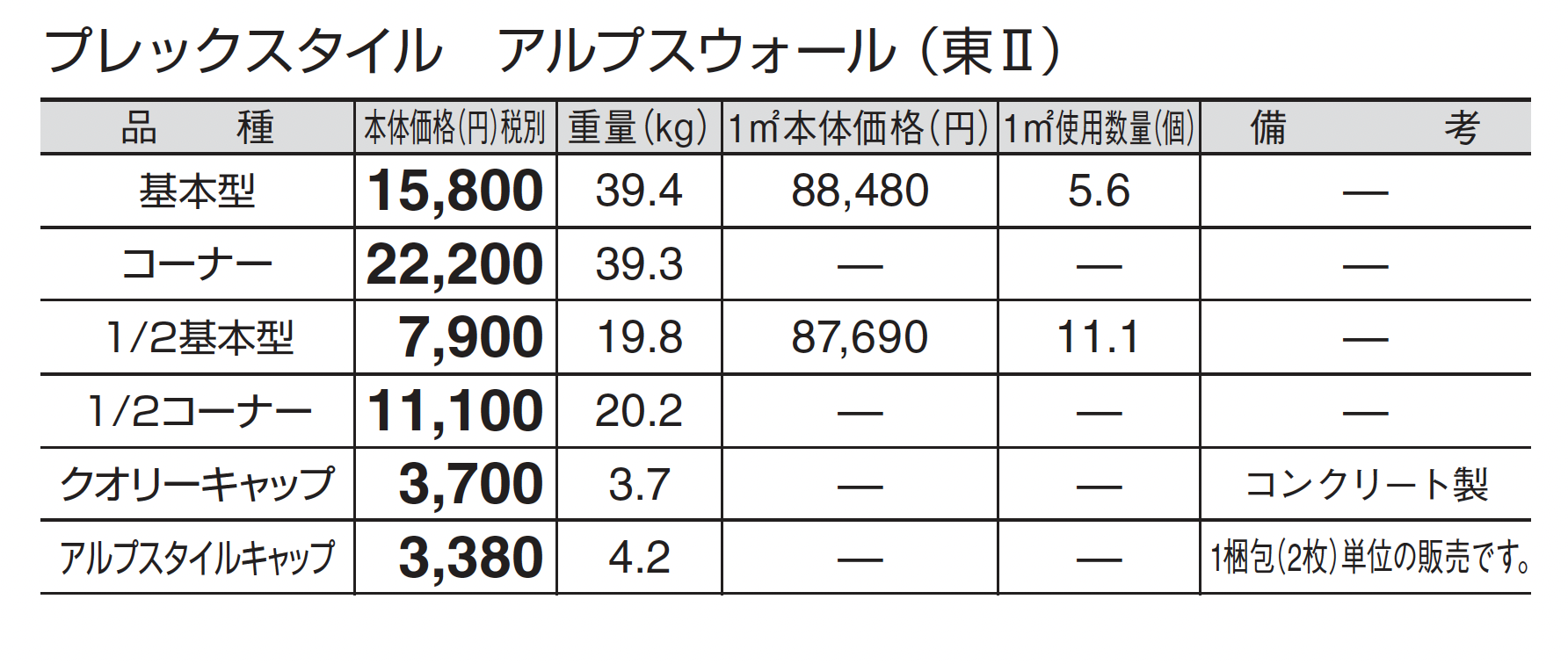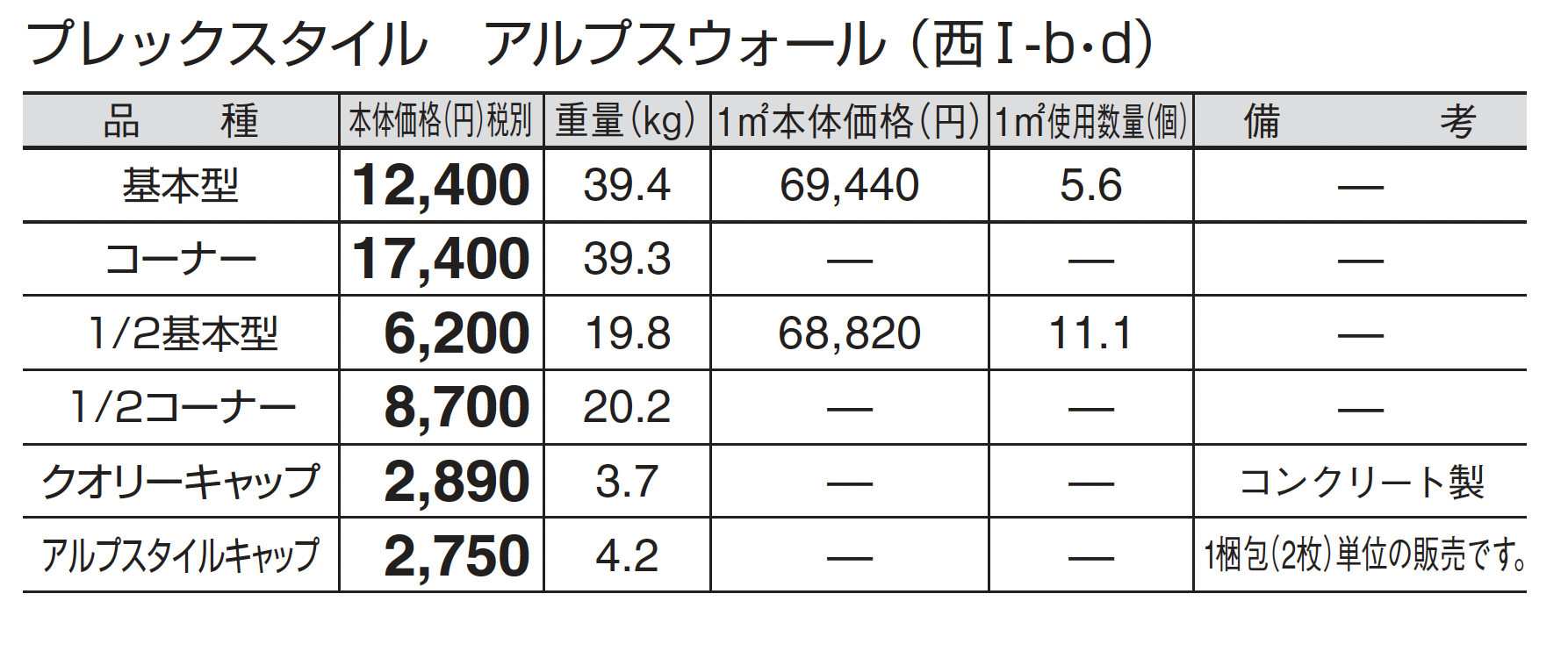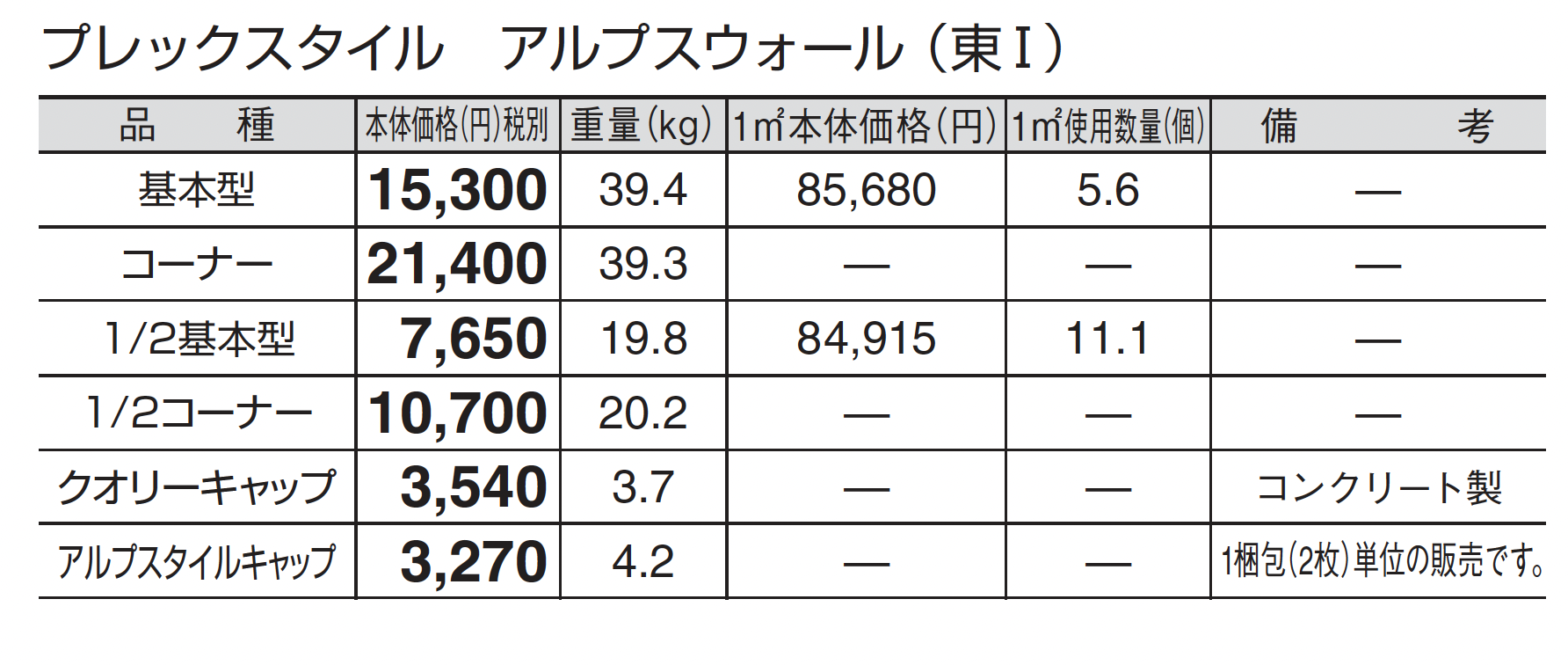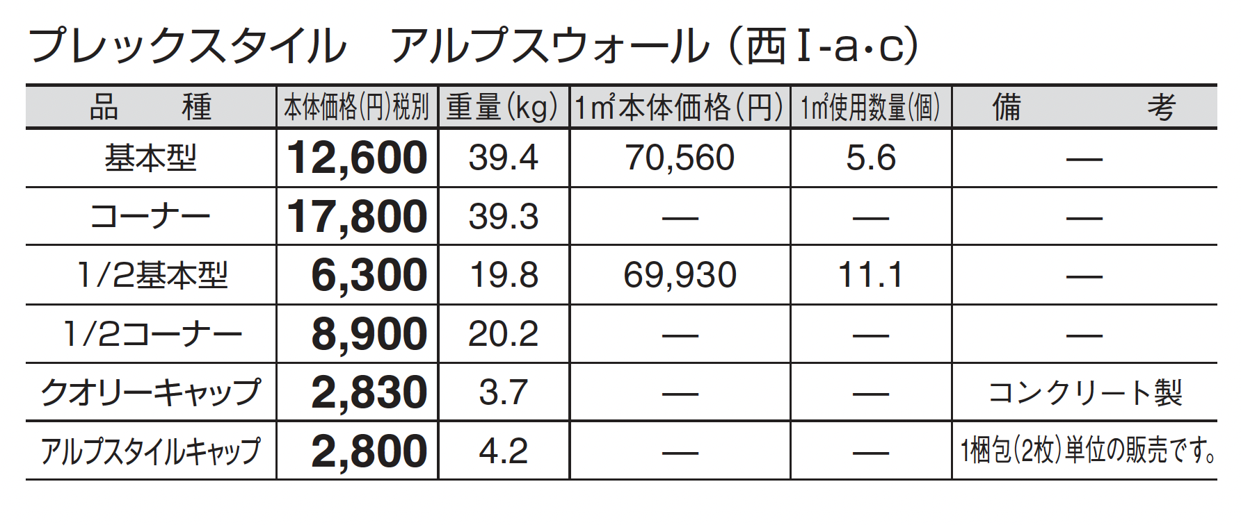 ●ブロック間は、4㎜程度の間隔をとって配置し、モルタルを充填してください。(タイルの目地間隔が≒5㎜になります)柔らかすぎるモルタルを使用すると、ブロック間から染み出る可能性がありますので、ご注意ください。 ●クオリーキャップの取り付けには、樹脂モルタルを使用することを推奨します。 ●アルプスタイルキャップの取り付けは、ブロック天端にモルタルを充填し、平らに仕上げ、モルタルの養生期間を経た後に、コンクリートとタイルに対応した接着剤を使用して貼り付けてください。 ●アルプスウォールのタイル箇所(特に端部)は、衝撃等により欠ける可能性があります。取り扱いには十分注意してください。 ●アルプスウォールのタイル箇所は焼物ですので、製品ごとに色幅があります。また、製造ロットにより寸法、色のバラつきがあります。 ●アルプスウォールに穴あけ加工やカット処理を行う際には、必ずタイル用の工具をご使用ください。また、製品端部への加工や過度な圧力を加えるなどにより、タイルに割れや亀裂がおこる場合があります。 ●輸入品のため欠品になる場合がありますので、納期をご確認ください。
