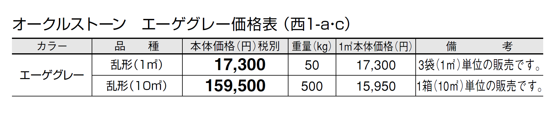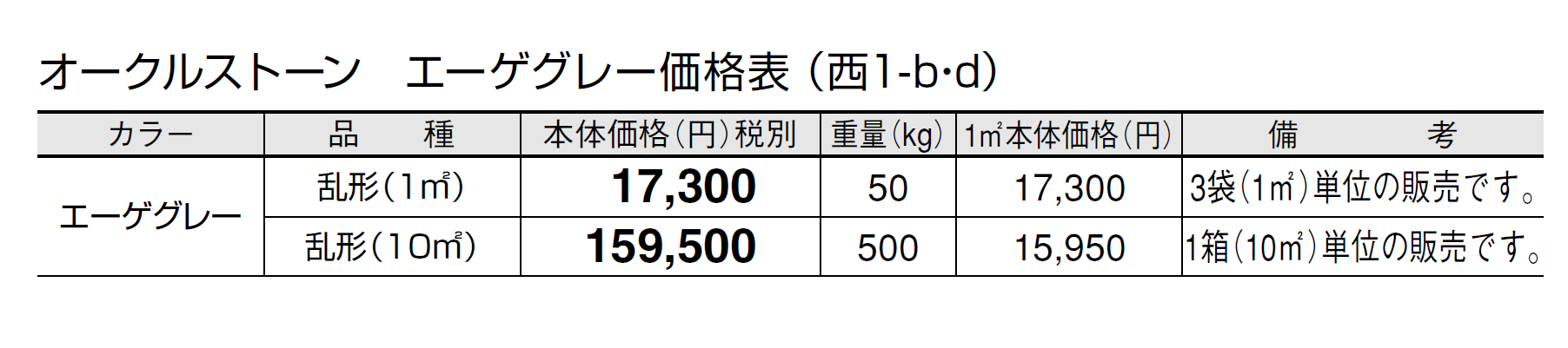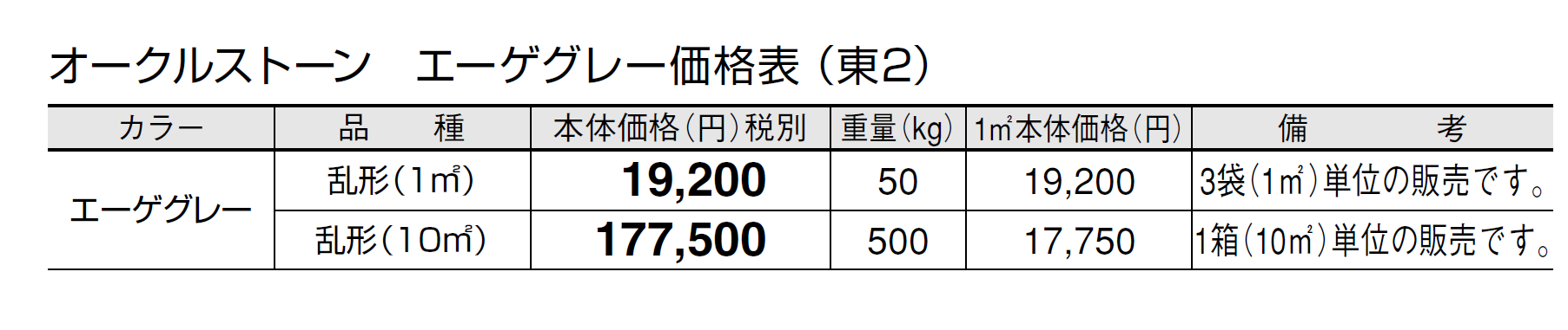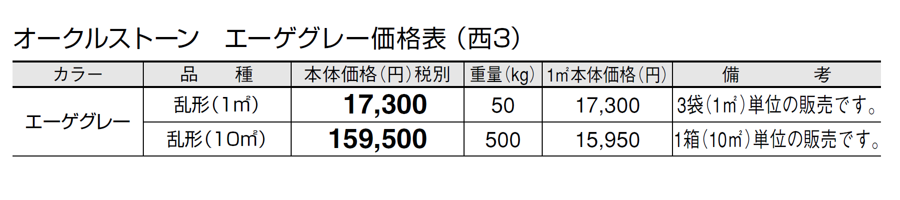 ●施工時にモルタルが表面に付着しないように注意してください。表面に付着したモルタルを洗い流す場合は、充分きれいな水で流してください。 ●設置条件、施工方法によってはモルタルのアクが表面に廻り、変色する恐れがあります。変色を抑えるため、浸透性吸水防止剤等の塗布をおすすめします。 ●オークルストーンは天然石のため写真よりも、一枚ごとに色、厚さ、大きさに幅があります。特にエーゲグレーは色幅が大きいのが特徴です。 ●天然石のため、色幅があります。また、色幅が偏る場合もあります。 ●天然石の特性上、スジ、ヒビ、ヘアクラック等が発生している場合があります。 ●エーゲグレーは天然石の性質上、白いコスレが入る場合があります。 ●天然石の特性上サビが入る場合があります。 ●必ず仮置きして、色、大きさのバランスを確認してから施工してください。裏・表で色が異なりますのでバランスを見て表・裏をご使用ください。 ●層状に剥離しそうな場合は、強制的にはがしてから施工してください。 ●乱形は、施工にロスがありますので、施工面積の2割前後余分の数量が必要です。 ●酸に弱いので酸洗いは避けてください。 ●輸入品のため欠品になる場合がありますので、納期をご確認ください。