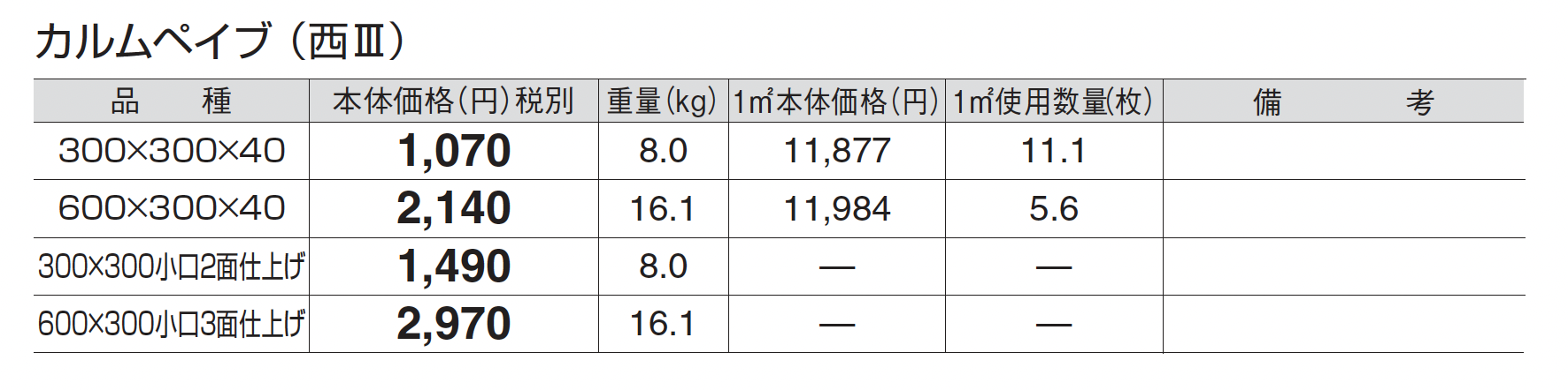 ●TOYOジョイサンド・ハードの施工方法、注意事項はP560をご参照ください。 ●使用量の目安は1袋/20kg当たりで300×300の場合で約8㎡、600×300の場合で約10㎡となります。 ●軒下や湿気を伴う場所にはウレタン樹脂で固める固定目地材での施工を行ってください。施工方法及び注意事項はP560をご参照ください。 ●自然な風合いを出すため、表面の色合い、テクスチャーに幅をもたせてあります。 ●表面意匠は300×300サイズは4パターン、600×300は3パターンあります。(柄の指定はできません。) ●側面の異形目地キープを突き合わせて施工しますが、製品特性上あえて目地幅がランダムになるようにしています。 ●小口使いをする場合にジョイサンドハードを使用する際は、小口から砂が流出しないよう簡易養生を行ってから施工してください。