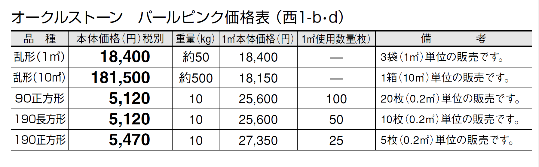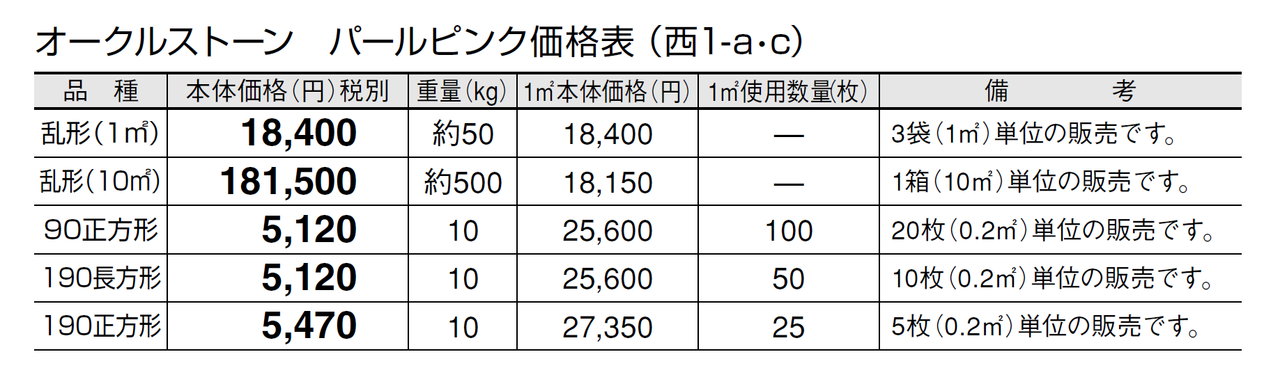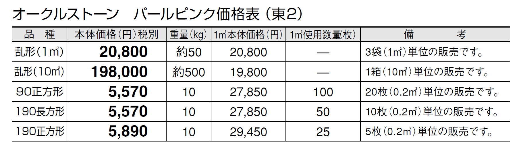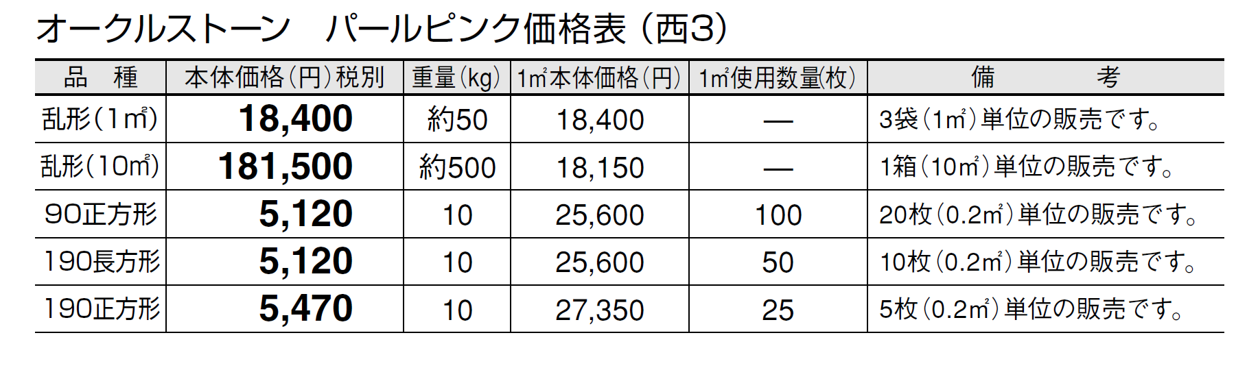 ●石材の性質上、車輌等が乗り入れすると表面が割れる恐れがありますので、そのような場所にはご使用にならないでください。 ●パールピンクの方形タイプは天然石の風合いを活かすため、一つ一つを手割り仕上げしております。大きさに幅があり、また、いびつな形状も含まれます。 ●施工時にモルタルが表面に付着しないように注意してください。表面に付着したモルタルを洗い流す場合は、充分きれいな水で流してください。 ●設置条件、施工方法によってはモルタルのアクが表面に廻り、変色する恐れがあります。変色を抑えるため、浸透性吸水防止剤等の塗布をおすすめします。 ●オークルストーンは天然石のため写真よりも、一枚ごとに色、厚さ、大きさに幅があります。特にパールピンクは色幅が大きいのが特徴です。また、色幅が偏る場合もあります。 ●天然石の特性上、スジ、ヒビ、ヘアクラック等が発生している場合があります。 ●サビの出やすい成分を含んでいます。 ●サビの発生を抑える対策として施工後、施工面全体に吸水防止剤「アクアシール」(P585)の塗布をお勧めします。 ●必ず仮置きして、色、大きさのバランスを確認してから施工してください。裏・表で色が異なりますのでバランスを見て表・裏をご使用ください。 ●層状に剥離しそうな場合は、強制的にはがしてから施工してください。 ●乱形は、施工にロスがありますので、施工面積の2割前後余分の数量が必要です。 ●酸に弱いので酸洗いは避けてください。 ●輸入品のため欠品になる場合がありますので、納期をご確認ください。 ●施工の際は、製品裏面に浸透性吸水防止剤を塗布してください。吸水防止剤は「アクアシール」(P585)を推奨します。 ●高圧洗浄機を使用してメンテナンスを行うと、表面の色が変わることがありますのでご注意ください。 ●車輌乗り入れ部には適しませんのでご注意ください。
