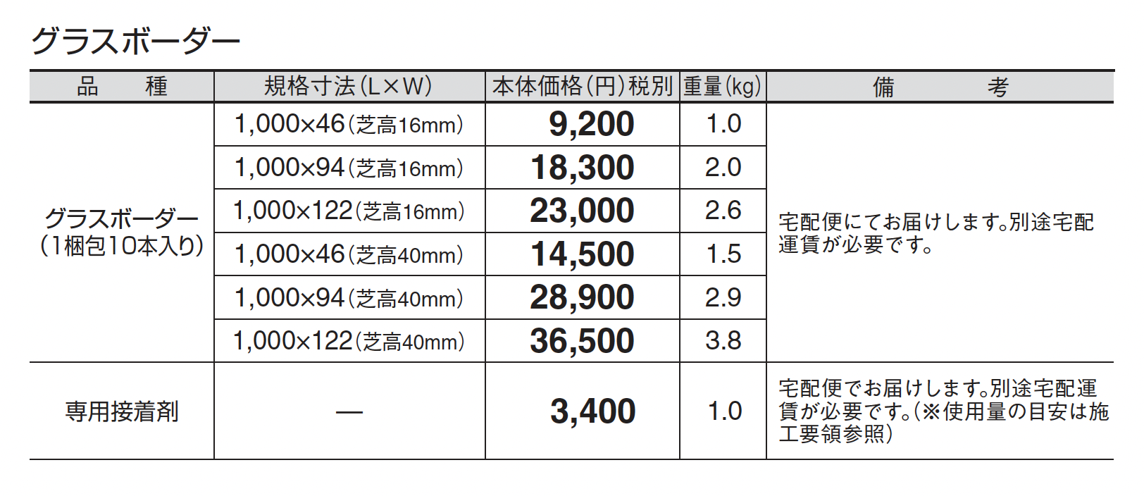 (注意点) ●本製品の幅は+1~2㎜の誤差が生じる場合があります。 ●本製品は、製品の特性上、シワや折り目がつく場合があります。その際は施工前に逆巻にしたり、スチーム等で温めシワ等のクセを直してからご使用ください。 ●本製品は、防炎製品となっておりますが火気は厳禁です。また、スチームやドライヤーで温める場合も適度に製品より離してご使用ください。 ●本製品は芝目がありますので、芝先端の方向が正面に向くように施工してください。 ●本製品は、水はけの悪い場所で使用するとカビ等が発生する場合がありますので排水勾配、排水口等を設けて施工してください。 ●本製品は使用年数の経過とともに色あせ等が起こる場合があります。 ●本製品をカットする際は芝の裏面よりカッターナイフでカットしてください。 ●本製品使用時にジョイント部はしっかりと突き合わせて使用することで隙間が目立たなくなります。基布(黒)部分が大きい場合は現地にてカッターナイフを用いてカットしてください。 ●専用接着剤は雨にあたると溶けてしまいますので、雨天時や雨が降りそうな時は施工を見合わせてください。また、高湿度80%以上の際は、固まりにくくなりますので天候に注意してください。 ●接着剤は凍結は厳禁です。気温5℃以上の環境で使用または保管してください。 ●接着剤使用の際、夏場の地表温度の高い時は打ち水を行うなどして接着面の温度を下げてからご使用ください。(接着剤の水分が無くなり使用できなくなる恐れがあります。) ●接着剤については水分が多く硬化後若干の縮みがあります。 ●舗装材表面に接着剤が付着しないように注意してください。 ●車両が乗り入れる箇所には芝高16㎜のものを必ず下地に全面接着してください。(芝高40㎜は車両乗入れ部には使用できません。) ●人工芝に輪荷重が静止した状態でかかっている時にハンドルを切ると芝糸を傷める恐れがありますので注意してください。