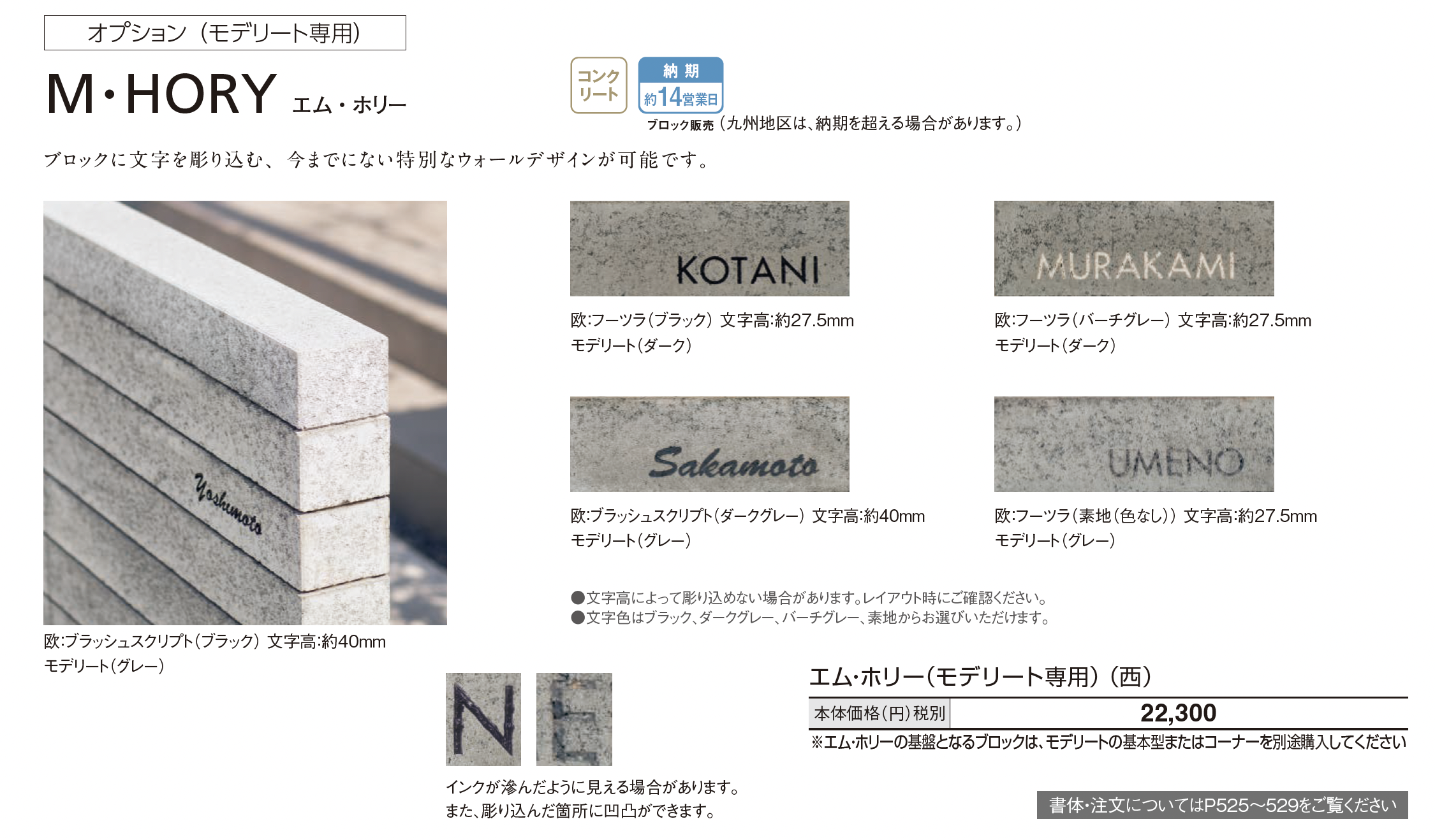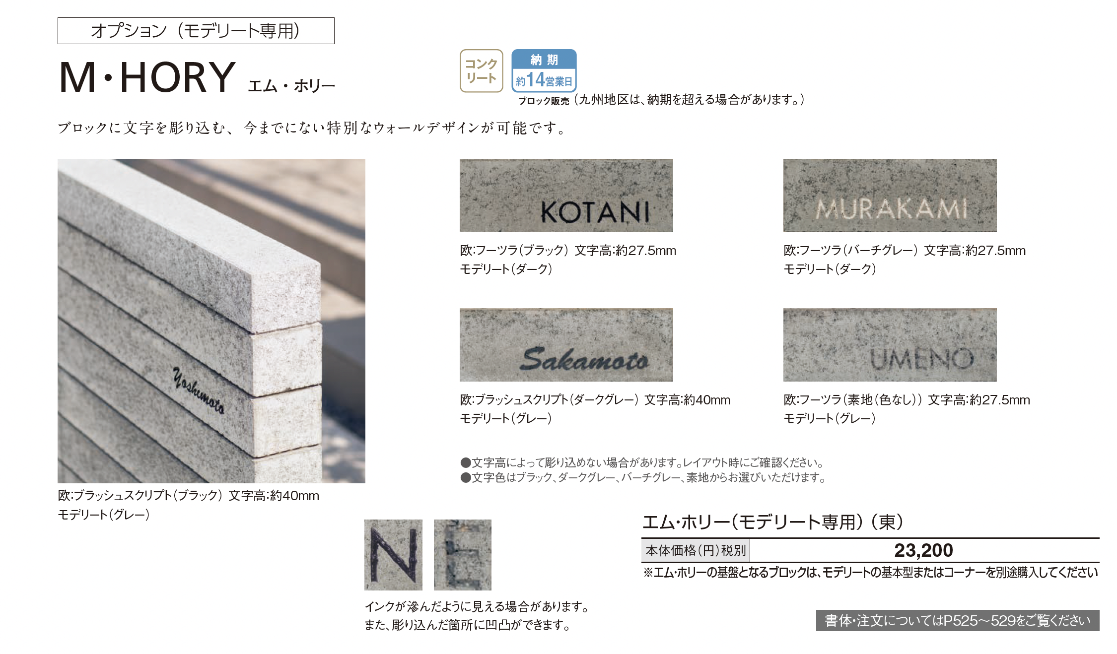 ●モデリートはコンクリートそのままのテクスチャーを表現していますので、製品表面の荒れ、若干の色ムラも特徴の一つです。 ●コンクリートブロックは、その目地塗面の全部にモルタルが行きわたるように組積してください。 ●製品の特性上、表面がこすれると白い傷が目立つ場合がありますので、取り扱いには十分にお気をつけください。 ●製造上、コーナー面の下部に小さなへこみが入ります。 ●オプションのエム・ホリーをご注文の場合、モデリートの納期がエム・ホリーと同じ約14日となります。