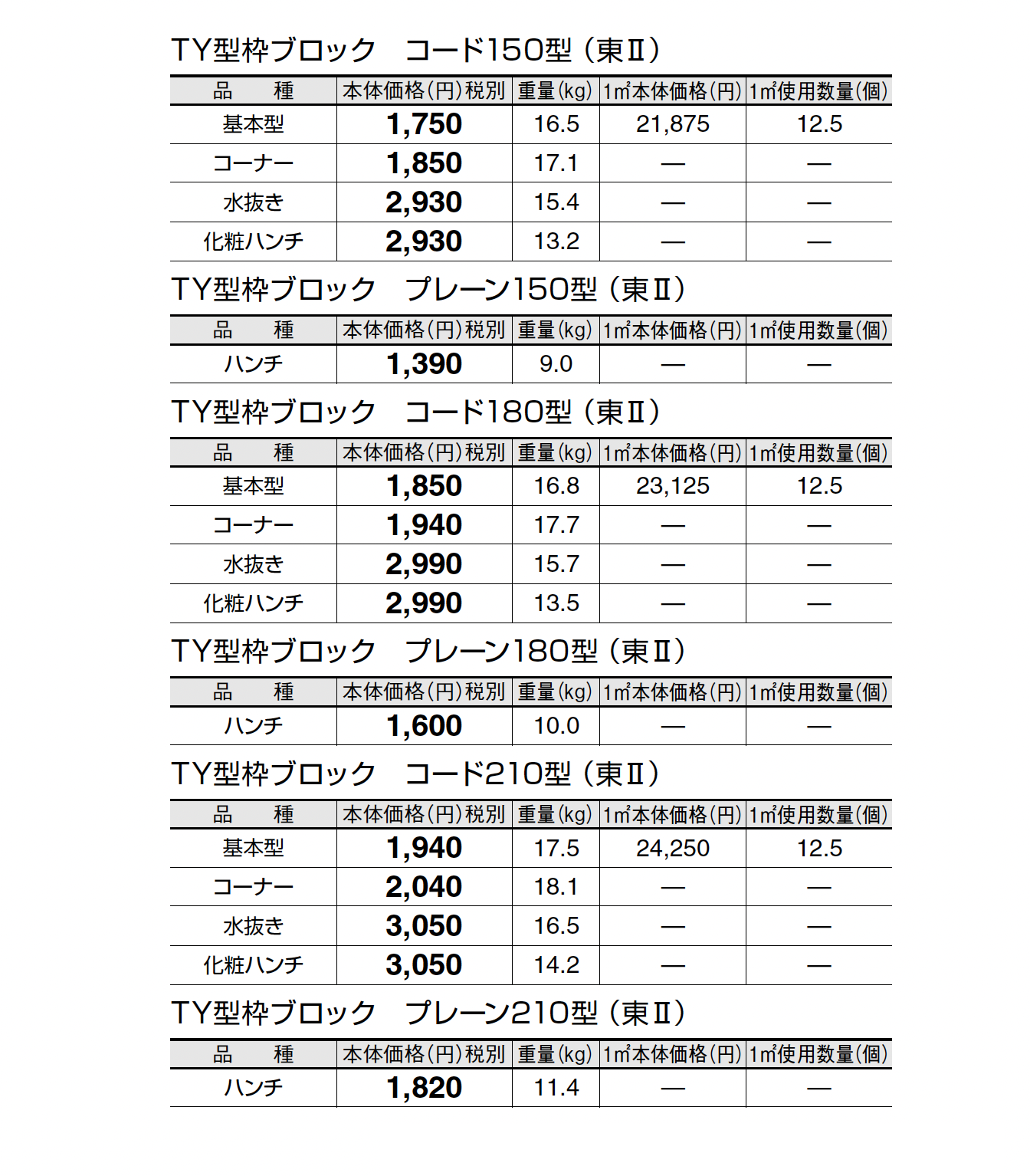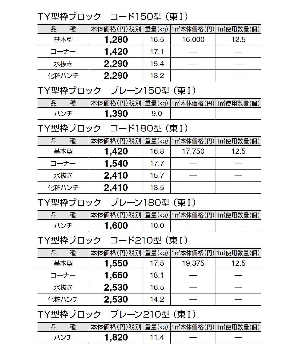 | 新旧品 | TY型枠ブロック コード【東日本】(エクステリア総合カタログ2025) |
