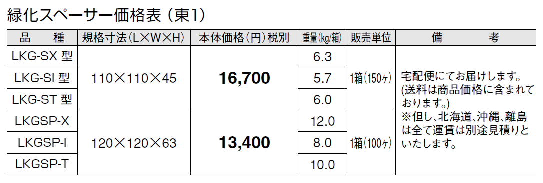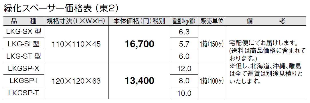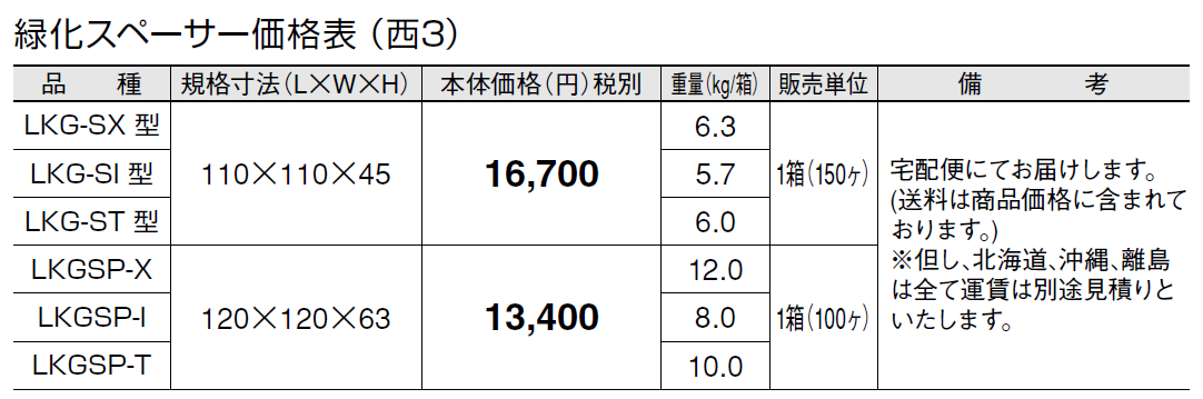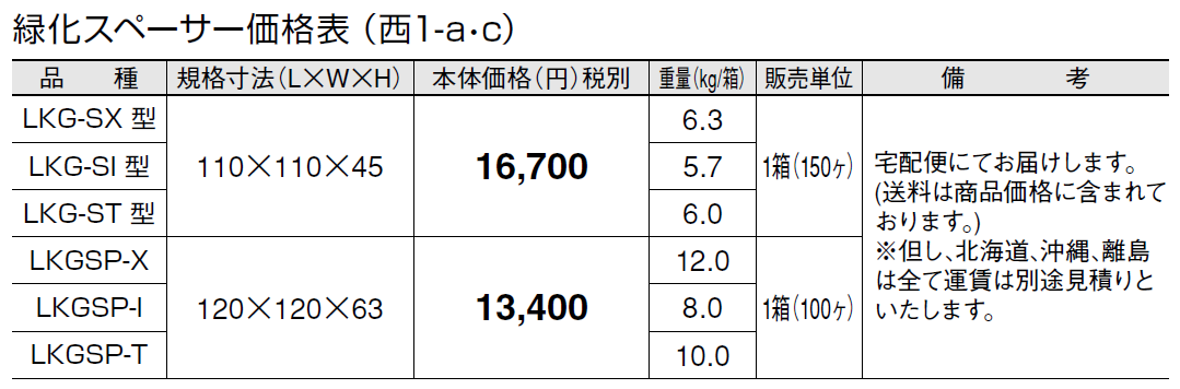 (注意点) ●LKGを天然芝と一緒に施工する場合は、車両が乗り入れるところには使用しないでください。 ●LKGSPは、車両が乗り入れるところに使用できますが、急な動作(急発進、急ブレーキ、急ハンドル)は不陸や破損の原因になりますので控えてください。 ●LKGSPを車両が乗り入れるところに、施工する場合に平板サイズが大きく、緑化スペーサーの芯々のピッチが300㎜以上となる場合には、中間にLKGSP-Iを使用してください。 ●お年寄りやお子様、ハイヒールの女性等の歩行や、車いす等での走行の際に、転倒などによるケガの恐れがありますのでご注意ください。 ●施工後は、芝生の生育に必要な管理(水やり、施肥、除草、芝刈り、害虫駆除等)を行ってください。 ●芝生は、高麗芝、野芝等の管理が容易なものが最適です。